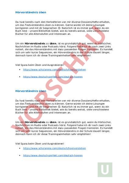 Hörverständnis üben Du hast bereits nach den Herbstferien von mir diverse Dossiers/Hefte erhalten, um das Textverständnis üben zu können. Gerne würde ich deine Lösungen korrigieren und mit dir besprechen