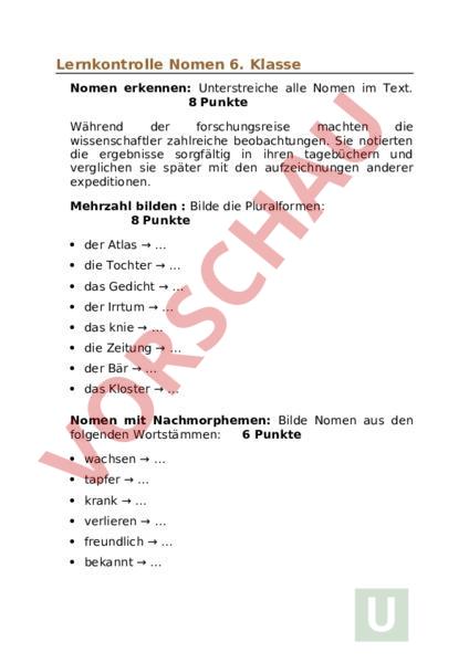 Lernkontrolle Nomen 6. Klasse Nomen erkennen: Unterstreiche alle Nomen im Text. 8 Punkte Während der forschungsreise machten die wissenschaftler zahlreiche beobachtungen. Sie notierten die ergebnisse sorgfältig in ihren tagebüchern und verglichen sie später mit den aufzeichnungen anderer expeditionen. Mehrzahl bilden Bilde die Pluralformen: 8 Punkte der Atlas die Tochter das Gedicht der Irrtum das knie die Zeitung der Bär das Kloster Nomen mit Nachmorphemen: Bilde Nomen aus den folgenden Wortstämmen: 6 Punkte wachsen tapfer krank verlieren freundlich bekannt Teekesselchen – 4 Punkte Erkläre die beiden Bedeutungen dieser Wörter: kiefer schimmel Signalwörter – 8 Punkte Unterstreiche die Signalwörter im Text und markiere das Nomen, das sie anzeigen: Beim malen hörte er musik. Zum spielen trafen sich die kinder im garten. Mit der erfindung wurde vieles einfacher. Lernkontrolle Nomen 5. Klasse 1. Nomen erkennen Unterstreiche alle Nomen im Text. 8 Punkte Auf dem markt boten die händler frisches gemüse, süsse früchte und würzige kräuter an. Viele besucherinnen und besucher kauften vorräte für das wochenende und probierten spezialitäten aus anderen ländern. 2. Mehrzahl bilden: Bilde die Pluralformen: 8 Punkte der Vogel das Tal die Mutter der Schlüssel das Datum die Gans der Schmetterling das Hemd 3. Nomen mit Nachmorphemen: Bilde Nomen aus den folgenden Wortstämmen: 6 Punkte bewegen sauber einsam dunkel traurig erinnern 4. Teekesselchen Erkläre die beiden Bedeutungen dieser Wörter: 4 Punkte fliege birne Lösungen 5. Klasse: Unterstrichen (Nomen): markt, händler, gemüse, früchte, kräuter, besucherinnen, besucher, vorräte, wochenende, spezialitäten, ländern 2. Mehrzahl bilden der vogel die vögel das tal die täler die mutter die mütter der schlüssel die schlüssel das datum die daten die gans die gänse der schmetterling die schmetterlinge das hemd die hemden 3. Nomen mit Nachmorphemen bewegen bewegung sauber sauberkeit einsam einsamkeit dunkel dunkelheit traurig traurigkeit erinnern erinnerung 4. Teekesselchen fliege Insekt Teil einer Krawatte birne Obst Glühbirne Lösungen 6. Klasse: forschungsreise, wissenschaftler, beobachtungen, ergebnisse, tagebüchern, aufzeichnungen, expeditionen 2. Mehrzahl bilden der atlas die atlanten die tochter die töchter das gedicht die gedichte der irrtum die irrtümer das knie die knie die zeitung die zeitungen der bär die bären das kloster die klöster 3. Nomen mit Nachmorphemen wachsen wachstum tapfer tapferkeit krank krankheit verlieren verlust freundlich freundlichkeit bekannt bekanntschaft 4. Teekesselchen kiefer Baumart Teil des Schädels schimmel Pilzbefall Pferd 5. Signalwörter Signalwörter (unterstrichen) und Nomen (markiert): Beim malen Zum spielen Mit erfindung Lernkontrolle Adjektive 5./6. Klasse: 1. Adjektive erkennen – 8 Punkte Unterstreiche alle Adjektive und Nomen im Text. Im mittelalterlichen bern lebten die menschen in engen gassen und wohnten in stabilen holzhäusern. Auf den weiten feldern arbeiteten sie hart, während die bunten mühlen am fluss das leben der dörfer prägten. Die mutigen bauern verteidigten ihr land gegen fremde angreifer, und die klugen städter organisierten die märkte auf dem großen platz. 2. Adjektive steigern – 8 Punkte Schreibe die Komparativ- und Superlativform der folgenden Adjektive. Achte auf Umlautänderungen oder unregelmäßige Steigerungen. jung gross klug stark hart schön nah interessant 3. Adjektive aus Nomen (Nachmorpheme) – 6 Punkte Bilde aus den folgenden Nomen ein Adjektiv mit einem passenden Nachmorphem (-ig, -isch, -lich, -bar ): regen kunst freund sonne magie liebe Lösung: 1. Adjektive erkennen – 8 Punkte Im mittelalterlichen BERN lebten die MENSCHEN in engen Gassen und wohnten in stabilen Holzhäusern. Auf den weiten Feldern arbeiteten sie hart, während die bunten Mühlen am Fluss das Leben der DÖRFER prägten. Die mutigen BAUERN verteidigten ihr LAND gegen fremde Angreifer, und die klugen STÄDTER organisierten die MÄRKTE auf dem großen Platz. Adjektive: mittelalterlichen, engen, stabilen, weiten, hart, bunten, mutigen, fremde, klugen, großen 2. Adjektive steigern – 8 Punkte Adjek Kompa Superlativ tiv rativ am jüngsten jung jünger groß größer am größten klug klüger am klügsten stark stärker am stärksten hart härter am härtesten Adjek Kompa Superlativ tiv rativ schön schöner am schönsten nah am nächsten näher am interes interess interessant sant anter esten 3. Adjektive aus Nomen (Nachmorpheme) – 6 Punkte No Adjekt me iv rege regneri sch kun künstle st risch freu freundli nd ch son sonnig ne mag magisc No Adjekt me iv ie lieb lieblich
