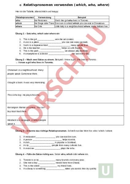 o Relativpronomen verwenden (which, who, where) Hier ist die Tabelle, übersichtlich und knapp: Relativpronomen Verwendung Beispiel who für Personen Shes the girl who lives in Toronto. which für Dinge oder Tiere Dim sum is food which you can eat in Chinatown. where für Orte Little Italy is neighbourhood where many Italians live. Übung 1 – Setz who, which oder where ein 1. 2. 3. 4. 5. 6. This is the girl won the art contest. zoo is place you can see many animals. Sushi is Japanese food many people love. He is the teacher helps us with English. This is the park we always play football. smartphone is device we use every day. Übung 2 – Mach zwei Sätze zu einem. Beispiel: know girl. She lives in Toronto. know girl who lives in Toronto. Chinatown is neighbourhood. Many people speak Cantonese there. bought book. It was very interesting. This is the boy. He plays the erhu. Kensington Market is place. You can buy local food there. Mandarin is language. billion people speak it. Übung 3 – Erkenne das richtige Relativpronomen. Schreib nur das Wort hin: who which where 1. 2. 3. 4. 5. restaurant you can eat dim sum. person helps tourists. dish is popular in Scotland. city people from many cultures live. musician plays the erhu. Übung 4 – Fülle die Sätze richtig aus. Setze who, which oder where ein. 1. 2. 3. 4. Toronto is city many tourists visit every year. She met boy moved here from Ghana. This is the street my friend lives. subway is something takes you across the city quickly. 5. Hes the student always asks good questions. 6. This is the shop they sell bubble tea. Relativpronomen verwenden (which, who, where) Relativpronomen Verwendung Beispiel who für Personen Shes the girl who lives in Toronto. which für Dinge oder Tiere Dim sum is food which you can eat in Chinatown. where für Orte Little Italy is neighbourhood where many Italians live. Übung 1 – Lückensätze mit who which where. Setz who, which, where ein. 1. 2. 3. 4. 5. 6. Chinatown is neighbourhood many tourists go to buy souvenirs. Torontonian is person lives in Toronto. Tim Hortons is place you can get coffee and donuts. The erhu is an instrument street musicians sometimes play in Chinatown. This is the guide showed us around Downtown Toronto. The CN Tower is building you can see from almost anywhere in the city. Übung 2 – Wähle das richtige Relativpronomen 1. The TTC is the transport system (which who where) takes you through the city. 2. Torontonian is someone (who which where) comes from Toronto. 3. Chinatown is place (who which where) you can find many Asian supermarkets. 4. Haggis is dish (who which where) Brian has eaten. 5. The Beach is neighbourhood (who which where) people live close to Lake Ontario. Gemischte Übungsaufgaben (who which where) Chinatown ist ein Ort, an dem viele bunte Schilder hängen. Das ist das Essen, das ich in Toronto probieren möchte. Ich kenne einen Jungen, der in der Nähe vom CN Tower wohnt. Das ist das Instrument, das der Musiker auf der Straße spielt. Er ist der Mann, der seit zwanzig Jahren in Toronto lebt. Das ist der Park, in dem viele Familien picknicken. Der CN Tower ist ein Gebäude, das man schon von weitem sehen kann. Sie ist die Touristin, die zum ersten Mal in Kanada ist. Aufgaben-Set – Relativpronomen (who which where) Thema: Chinatown – Toronto – Canada 1. Ergänze mit who, which oder where 1. Chinatown is part of Toronto many tourists visit every year. 2. lot of people live in Chinatown you can find many Asian shops. 3. Toronto is city is famous for its multicultural neighborhoods. 4. The people work in Chinatown are very friendly. 5. The restaurants serve traditional Chinese food are always full. 6. Canada is country welcomes people from many nations. 2. Verbinde die Sätze mit einem Relativpronomen 1. Toronto has large Chinatown. Many movies were filmed there. Toronto has large Chinatown many movies were filmed. 2. met woman. She grew up in Torontos Chinatown. met woman grew up in Torontos Chinatown. 3. We ate in restaurant. It makes the best dumplings in the city. We ate in restaurant makes the best dumplings in the city. 4. Chinatown is place in Toronto. You can buy many traditional products there. Chinatown is place in Toronto you can buy many traditional products. 3. Wähle das richtige Relativpronomen 1. The CN Tower, is in Toronto, is very famous. 2. The people live in Chinatown celebrate many festivals. 3. The shop sells bubble tea is very popular. 4. Toronto is city many cultures meet. 5. The street the dragon dance takes place is very long. 6. The people run the tea shops are very welcoming. 7. The lanterns hang above the streets look beautiful at night. 8. Chinatown is the place we started our city tour. 4. Wähle das richtige Relativpronomen 1. Kensington Market is place (who where which) many tourists love. 2. The man (who where which) helped us lives in Toronto. 3. Thats the restaurant (where who which) we ate lunch yesterday. 4. The animals (who which where) live at the Toronto Zoo are well cared for. 5. The street (which who where) leads to the CN Tower is very crowded. Relativpronomen verwenden (which, who, where) Relativpronomen Verwendung who für Personen; wenn die Person etwas tut oder beschrieben wird which für Dinge oder Tiere; wenn du Eigenschaften, Fakten oder Infos über das Ding nennst where für Orte; wenn dort eine Handlung stattfindet oder der Ort der Schauplatz ist Übungen – Relativpronomen (which who where) Thema: Toronto 1. Setze which, who oder where ein 1. The CN Tower, is the tallest building in Toronto, is famous worldwide. 2. Chinatown is neighbourhood you can buy great street food. 3. The guide showed us around the city was very friendly. 4. We visited museum had special exhibition about Canada. 5. This is the street the Toronto Raptors celebrated their victory. 6. The people live near the Harbourfront love the view. 7. Thats the ferry takes you to the Toronto Islands. 8. met woman works at the Eaton Centre. 2.