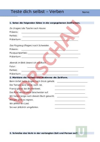 Teste dich selbst – Verben Name: 1. Setze die folgenden Sätze in die vorgegebenen Zeitformen. Du (tragen) die Tasche nach Hause. Präsens: Perfekt: Präteritum: Das Flugzeug (fliegen) nach Schweden. Präsens: Plusquamperfekt: Präteritum: Abends im Bett (lesen) ich ein Buch. Futur: Perfekt: Präteritum: 2. Markiere die Verben und bestimme die Zeitform. Beim Unfall hatte Angela noch Glück gehabt. Die Tomate wird schon noch rot. Franco giesst das Blumenbeet. Das Kind wuchs ohne Geschwister auf. Wir haben lange nach diesem Buch gesucht. Morgen wird es regnen. Wir pfiffen ein Lied. Sie war plötzlich umgefallen. 3. Schreibe das Verb in der verlangten Zeit und Person auf! fahren 3. Person Plural Futur halten 1. Person Singular Präsens bremsen 2. Person Plural Perfekt sehen 3. Person Singular Präteritum gehen 3. Person Plural Plusquamperfekt tanzen 1. Person Plural Futur haben 2. Person Singular Perfekt sein 1. Person Singular Plusquamperfekt 4. Markiere alle Verben. Drei Verben sind in diesem Text getrennt Lesenacht Heute Abend trifft sich unsere Klasse im Schulzimmer. Wir gestalten eine Lesenacht. Wir sind alle ganz aufgeregt. Zuerst packen wir alle unsere Bücher aus. Die Lehrerin liest uns eine lustige Geschichte vor. Einige lachen laut. Dann essen wir unsere Brötchen, trinken einen warmen Tee und erzählen uns Witze. Nun legen wir unsere Schlafmatten auf den Boden, putzen unsere Zähne und schlüpfen in die Schlafsäcke. Wir dürfen noch einen Augenblick miteinander plaudern. Dann knipsen wir unsere Taschenlampen an und lesen in unseren Büchern. Er wird ganz still. Wir dürfen nicht mehr schwatzen. Denn wer müde ist, kann jetzt schlafen. 5. Schreibe die Verben in der Klammer in der verlangten Zeit (Achtung, du brauchst nicht alle Linien.) Nachdem ich das Haus (verlassen, Plusquamperfekt) (beginnen, Prätertitum) . es zu regnen Bestimmt (springen, Perfekt) . ein Panther aus dem Gehege ., denn er (angreifen, Präsens) . einige Passanten auf der Strasse (Anrufen, Futur) . du mich einmal ., wenn ich nicht mehr hier (sein, Präsens) .? Nachdem du im Lotto (gewinnen, Plusquamperfekt) ., (wollen, Präteritum) . wir eine Party machen Jennifer (werden Futur) braun ., wenn sie so lange in der Sonne (sitzen, Präsens) . Puh, endlich (lesen, Perfekt) . ich dieses Buch . 6. Schreibe die Verben in der Befehlsform in die Lücken. Bei der Theaterprobe rät die Regisseurin Tina. (sprechen) diesen Satz etwas leiser. (schauen) nicht ins Publikum. (geben) ein deutliches Zeichen. Bei der Theaterprobe rät die Regisseurin Damaris und Massimo. (kommen) gemeinsam auf die Bühne. (geben) einander die Hand. (treffen) euch mit grösserer Begeisterung. Personalformen Verben können in verschiedenen Personalformen stehen. Singular (Einzahl) Plural (Mehrzahl) 1. Person ich lache wir lachen 2. Person du lachst ihr lacht 3. Person er/sie/es lacht sie lachen Zeitformen Eine Situation kann entweder in der Vergangenheit (früher), in der Gegenwart (jetzt) oder in der Zukunft stattfinden. Futur (Zukunft) Er wird seine Hausaufgaben machen. Wir werden in der Schule sein. Präsens (Gegenwart) Er macht seine Hausaufgaben. Wir sind in der Schule. Perfekt (Vorvergangenheit) Er hat seine Hausaufgaben gemacht. Wir sind in der Schule gewesen. Präteritum (Vergangenheit) Er machte seine Hausaufgaben. Wir waren in der Schule. Plusquamperfekt (Vergangenheit) Er hatte seine Hausaufgaben gemacht. Wir waren in der Schule gewesen.