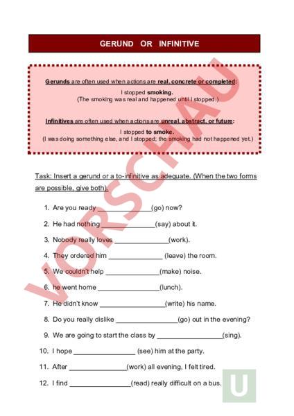 GERUND OR INFINITIVE Gerunds are often used when actions are real, concrete or completed: stopped smoking. (The smoking was real and happened until stopped.) Infinitives are often used when actions are unreal, abstract, or future: stopped to smoke. (I was doing something else, and stopped; the smoking had not happened yet.) Task: Insert gerund or to-infinitive as adequate. (When the two forms are possible, give both). 1. Are you ready (go) now? 2. He had nothing (say) about it. 3. Nobody really loves (work). 4. They ordered him (leave) the room. 5. We couldnt help (make) noise. 6. he went home (lunch). 7. He didnt know(write) his name. 8. Do you really dislike (go) out in the evening? 9. We are going to start the class by(sing). 10. hope (see) him at the party. 11. After(work) all evening, felt tired. 12. find (read) really difficult on bus. 13. Its nice of you (come). 14. Its difficult (keep) the class clean. 15. Stop (speak)! 16. They expect us(arrive) at seven. 17. Kate suggested (go) for walk. 18. The car seemed(be) broken. 19. We dont like(have) to do extra work. 20. They begged me (see) the photographs.