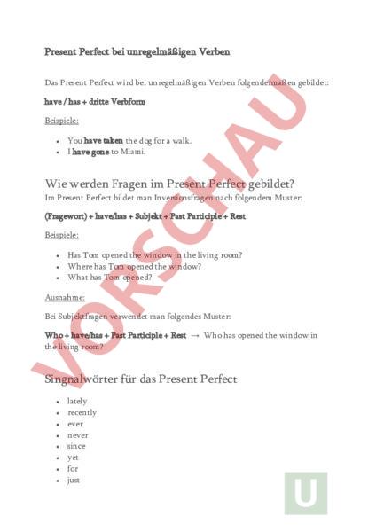 Present Perfect bei unregelmäßigen Verben Das Present Perfect wird bei unregelmäßigen Verben folgendermaßen gebildet: have has dritte Verbform Beispiele: • • You have taken the dog for walk. have gone to Miami. Wie werden Fragen im Present Perfect gebildet? Im Present Perfect bildet man Inversionsfragen nach folgendem Muster: (Fragewort) have/has Subjekt Past Participle Rest Beispiele: • • • Has Tom opened the window in the living room? Where has Tom opened the window? What has Tom opened? Ausnahme: Bei Subjektfragen verwendet man folgendes Muster: Who have/has Past Participle Rest Who has opened the window in the living room? Singnalwörter für das Present Perfect • • • • • • • • lately recently ever never since yet for just • already