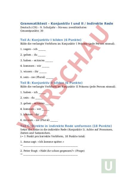 Grammatiktest – Konjunktiv und II Indirekte Rede Deutsch (CH) – 9. Schuljahr – Niveau: zweithöchstes Gesamtpunkte: 30 Teil A: Konjunktiv bilden (6 Punkte) Bilde die verlangte Verbform im Konjunktiv Präsens (jede Person einmal). 1. sagen – ich 2. gehen – du 3. haben – er/sie/es 4. kommen – wir 5. wissen – ihr 6. sein – sie (Plural) Teil B: Konjunktiv II bilden (6 Punkte) Bilde die verlangte Verbform im Konjunktiv II Präsens (jede Person einmal). 1. haben – ich 2. sein – du 3. gehen – er/sie/es 4. kommen – wir 5. können – ihr 6. müssen – sie (Plural) Teil C: Direkte in indirekte Rede umformen (18 Punkte) Setze die Sätze in die indirekte Rede (Konjunktiv I). Achte auf Pronomen, Zeiten und Satzzeichen. ( 1 Punkt pro korrekte Verbform, 18 Punkte total) 1. Anna sagt: «Ich komme später.» 2. Peter fragt: «Habt ihr schon gegessen?» (Frage) 3. Der Lehrer erklärt: «Ihr müsst das morgen abgeben.» 4. Tom erzählt: «Ich war krank.» 5. Sie sagt: «Er ist mein Freund.» 6. Der Schüler ruft: «Ich habe die Hausaufgabe gemacht!» 7. Der Direktor sagt: «Die Schule bleibt morgen geschlossen.» 8. Lisa erzählt: «Ich kann gut schwimmen.» 9. Markus befiehlt: «Kommt sofort hierher!» (Befehl) 10. Der Trainer fragt: «Spielen wir morgen wieder?» (Frage) 11. Nina sagt: «Ich habe heute Geburtstag.» 12. Paul meint: «Wir gehen morgen ins Kino.» 13. Lara erzählt: «Meine Mutter arbeitet im Spital.» 14. Der Schüler fragt: «Darf ich auf die Toilette gehen?» (Frage) 15. Die Mutter ruft: «Räum dein Zimmer auf!» (Befehl) 16. Der Wetterdienst meldet: «Morgen wird es regnen.» 17. Jonas sagt: «Ich kann das besser.» 18. Der Vater erklärt: «Wir haben keinen Strom mehr.»