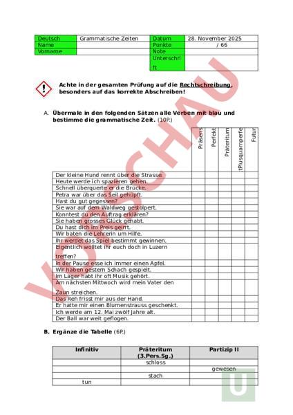Deutsch Name Vorname Grammatische Zeiten Datum Punkte Note Unterschri 28. November 2025 66 ft Achte in der gesamten Prüfung auf die Rechtschreibung, besonders auf das korrekte Abschreiben! Der kleine Hund rennt über die Strasse. Heute werde ich spazieren gehen. Schnell überquerte er die Brücke. Petra war über das Seil gehüpft. Hast du gut gegessen? Sie war auf dem Waldweg gestolpert. Konntest du den Auftrag erklären? Sie haben grosses Glück gehabt. Du hast dich im Preis geirrt. Wir baten die Lehrerin um Hilfe. Ihr werdet das Spiel bestimmt gewinnen. Eigentlich wolltet ihr euch doch in Luzern treffen? In der Pause esse ich immer einen Apfel. Wir haben gestern Schach gespielt. Im Lager habt ihr oft Musik gehört. Am nächsten Mittwoch wird mein Vater den Zaun streichen. Das Reh frisst mir aus der Hand. Er hatte mir einen Blumenstrauss geschenkt. Ich werde am 12. Mai zwölf Jahre alt. Der Ball war weit geflogen. B. Ergänze die Tabelle (6P.) Infinitiv Präteritum (3.Pers.Sg.) schloss Partizip II gewesen stach tun Futur ktPlusquamperfe Präteritum Perfekt Präsens A. Übermale in den folgenden Sätzen alle Verben mit blau und bestimme die grammatische Zeit. (10P.) gesungen verzeihen C. Setze die Verben in Klammern im Präteritum in die Lücken. (20P.) Bereits am frühen Morgen (sein) wir an der Talstation. Mir (gefallen) es, da es noch wenig Leute (haben). In aller Ruhe (fahren) unser Lift über die verschneiten Bäume und wir (geniessen) die Aussicht ins Tal. Der Schnee (glitzern) in der Sonne, ab und zu (sehen) man frische Tierspuren. Als ich oben (ankommen), (nehmen) ich meine Stöcke in die Hände. Genussvoll (hinuntergleiten) ich ins Tal Vor langer Zeit (herrschen) ein grosser Mann. Dieser König (reiten) einst auf die Jagd. Auf seinem Arm (tragen) er seinen treuen Falken. Dieser (schlagen) wild mit seinen Flügeln, als er seine Beute (sehen). Das erbeutete Tier (sein) eine Maus. Der Meister des Falken (lachen) über den Fang und (meinen): «Das letzte Mal (bringen) du mir aber einen Hasen!» Gemütlich (begeben) sich die Zwei auf ihren Heimweg. D. Bestimme die Zeitform und schreibe dann den Satz neu in der verlangten Zeitform. (12P.) Iris wusste heute viel Plusqua mp. Die Mutter wird das Kind tragen. Perfekt Ich hänge den Mantel an den Haken. Präteritu Das Bäumchen war schnell gewachsen. Präsens Ich traf am am Samstag den Goalie meiner Lieblingsmannschaft. Futur Sandra hat eine Frage gestellt. Plusqua mp. Lisa kletterte auf einen hohen Baum. Futur Schnell mache ich mir ein paar Notizen. Perfekt E. Verbinde die beiden Sätze und verwende dabei das Präteritum und das Plusquamperfekt. (Tipp: Bilde die Sätze mit «nachdem».) (6P.) Urs suchte den Koffer im Estrich. Dort verstaute er diesen letztes Jahr. Ron bereitete sich sehr lange vor. Er wagte den Sprung vom 10-MeterBrett. Das Tram hielt an. Die Türen öffneten sich. unterwegs. Wir waren von Donaueschingen bis Regensburg Futur Präteritum ktPlusquamperfe Strassburg lag im Sonnenschein. Die Pilger sind nach Santiago de Compostela Perfekt Präsens F. Zeiten erkennen, kreuz und quer durch Europa (12P.) geradelt. Gerne denke ich an die Herbsttage in der Ardèche zurück. Werden wir uns in Gstaad zum Skifahren treffen? In Bad Tölz haben wir dann übernachtet. In Turin machten wir eine Abendspaziergang. Im Schwarzwald hatte es die ganze Nacht geschneit. Nächstes Jahr fahren wir wieder nach Lloret de Mar. Die Temperatur des Mittelmeeres lud nicht zum Baden ein. Nathalie wird uns durch Moskau führen. Die Turmuhr von Big Ben schlug Mitternacht. Im Skagerrak waren wir in einen heftigen Sturm geraten. Jekaterinburg hat früher Sverdlowsk geheissen. Warum willst du nicht mit uns nach Rimini fahren? Die Fähre wird uns von Genua nach Korsika bringen. Seid ihr schon einmal mit dem Orient-Express gefahren? Die Cowboys der Camargue nennt man Gardians. Hungrig und vor allem durstig trafen wir in Budweis ein. In Heidelberg besuchen wir immer das Schloss. Bist du damals durch die Ardennen gefahren? Sie wird wohl zu ihrer Oma nach Spanien fahren. Marseille hatte mir sehr gut gefallen. An die Reise zum Nordkap werde ich mich ewig erinnern.