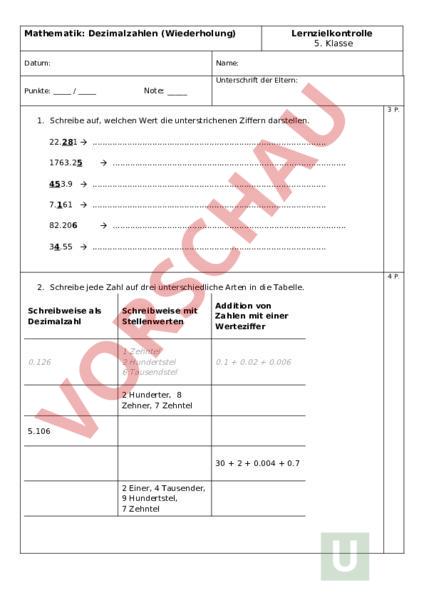 Arbeitsblatt: Test Dezimalzahlen (Wiederholung)