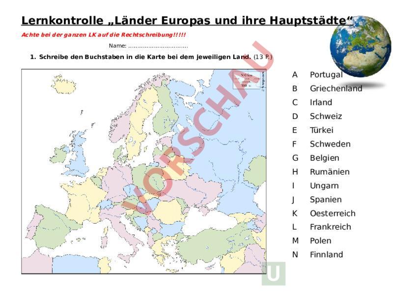 Lernkontrolle „Länder Europas und ihre Hauptstädte Achte bei der ganzen LK auf die Rechtschreibung!!!!! Name: 1. Schreibe den Buchstaben in die Karte bei dem jeweiligen Land. (13 P.) Portugal Griechenland Irland Schweiz Türkei Schweden Belgien Rumänien Ungarn Spanien Oesterreich Frankreich Polen Finnland 2. Fülle die Tabelle richtig aus! (10 P.) Land Hauptstadt Italien Reykjavik Norwegen Berlin Dänemark Amsterdam Bulgarien Prag Grossbritannien Zagreb 3. Stimmt die Aussage oder nicht? Kreuze das Zutreffende an. (7 P.) Aussage Kiew ist die Hauptstadt der Ukraine. Die Hauptstadt von Litauen heisst Riga. San Marino ist eine Exklave von Italien. Bratislava ist die Hauptstadt der Slowakei. Russlands Hauptstadt heisst Minsk. Irland gehört zu Grossbritannien. Istanbul ist die Hauptstadt der Türkei. stimmt stimmt nicht