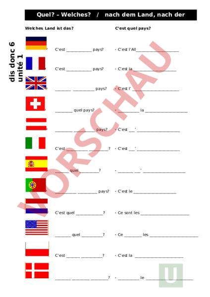 Quel? – Welches? nach dem Land, nach der Farbe fragen dis donc 6 unité 1 Welches Land ist das? Cest quel pays? Cest pays? Cest l‘All Cest pays? Cest la pays? Cest quel pays? la pays? Cest Cest ? Cest quel ? pays? Cest le Cest quel ? Ce sont les quel? Ce les Cest ? Cest la ? le Cest quel? Cest la Cest ? la Norvège ? Toi? est ton? – Mon pays Et les autres de ta classe? – Frage deine MitschülerInnen nach der Herkunft. Patrik, est ton - pays cest Floriana, est ton - pays cest Albion, ton - cest Henrique, est pays cest Davis, est ton - pays cest Refajet, est ton cest Rui, pays cest Rayan, est ton ?- pays cest Cest quelle couleur (f.) – Welche Farbe ist das?? Cest bleu.? ? ? ? ? ? ? ? ? ? ? Frage nach der Farbe Cest quelle couleur? Nach dem Tag fragen Cest quel jour aujourd‘hui? Cest dimanche. Montag Dienstag Mittwoch Donnerstag Freitag Samstag Sonntag Quelle heure est-il? Il est quatre heures. Il est quinze heures. Wie spät ist es? Il est dix heures. Il est six heures. Il est dix heures. Il est seize heures. Il est cinq heures. Il est huit heures. Il est neuf heures. Il est vingt et une heures. Il est une heure. Il est dix-neuf heures. Il est quatorze heures. Il est douze heures. Il est quinze heures. Il est treize heures. WORDS IN SINGULAR: leaf cherry person strawberry sheep shelf watch Il est dix-sept heures. Il est vingt-deux heures. Il est onze heures. paintbrush Il est vingt et une heures. fox match knife loaf potato mouse puppy tomato glass Wie spät ist es? Es ist drei Uhr. Quelle heure est-il? – Il est trois heures. Cest quelle date aujourdhui? heute? Welches Datum ist 1. Wir üben in der Gruppe. Fragt nach dem Datum und gebt Antwort. 2. Notiere Beispiele wie hier angegeben: Cest quelle date aujourdhui? Aujourdhui cest le