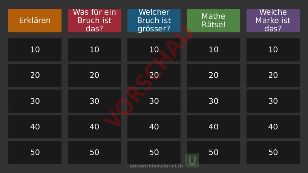 Erklären Was für ein Bruch ist das? Welcher Bruch ist grösser? Mathe Rätsel Welche Marke ist das? 10 10 10 10 10 20 20 20 20 20 30 30 30 30 30 40 40 40 40 40 50 50 50 50 50 Erklären Questio Catégorie 1 3 4 10 Répons 3 4 Zähler Nenner Bruchstrich Zähne Catégorie 1 10 Questio Was beschreibt der Zähler? Catégorie 1 20 Répons Der Zähler beschreibt wie viele Teile des Ganzen noch « gemeint » sind Beispiel: Von ursprünglich vier Kuchenstücken, sind noch drei Kuchenstücke übrig. Catégorie 1 20 Questio Was beschreibt der Nenner? Catégorie 1 30 Répons Der Nenner beschreibt, in wie viele Teile das Ganze geteilt wurde. Catégorie 1 30 Questio Der Zähler eines Bruchs wird vergrössert: Wird der Bruch dann grösser oder kleiner? Catégorie 1 40 Répons Der Bruch wird grösser. Aus dem einen Bruchstück wurden zwei gemacht. Catégorie 1 40 Questio Der Nenner eines Bruchs wird vergrössert: Wird der Bruch dann grösser oder kleiner? Catégorie 1 50 Répons Der Bruch wird kleiner. Es wurden quasi kleiner Kuchenstücke geschnitten. Catégorie 1 50 Was für ein Bruch ist das? Questio Catégorie 2 10 Répons Catégorie 2 4 8 10 Questio Catégorie 2 20 Répons Catégorie 2 1 4 20 Questio Catégorie 2 30 Répons Catégorie 2 30 Questio Catégorie 2 40 Répons Catégorie 2 40 Questio Catégorie 2 50 Répons 1 Catégorie 2 50 Welcher Bruch ist grösser? Questio oder Catégorie 3 10 Répons Catégorie 3 6 8 10 Questio oder Catégorie 3 20 Répons Catégorie 3 1 7 20 Questio 2 1