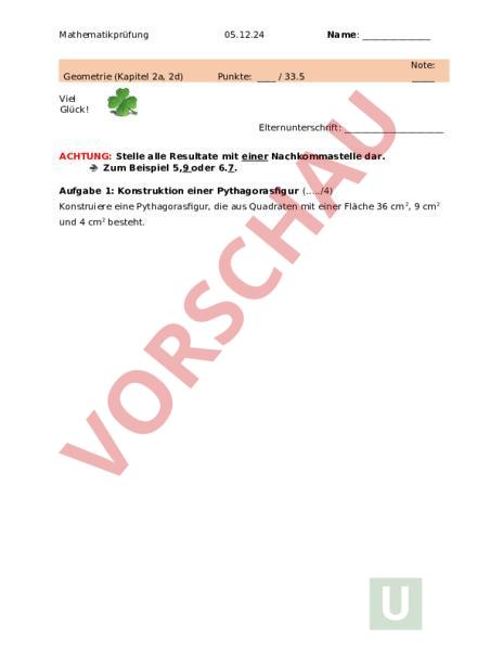 Mathematikprüfung Geometrie (Kapitel 2a, 2d) 05.12.24 Name: Punkte: 33.5 Note: Viel Glück! Elternunterschrift: ACHTUNG: Stelle alle Resultate mit einer Nachkommastelle dar. Zum Beispiel 5,9 oder 6.7. Aufgabe 1: Konstruktion einer Pythagorasfigur (/4) Konstruiere eine Pythagorasfigur, die aus Quadraten mit einer Fläche 36 cm 2, 9 cm2 und 4 cm2 besteht. Mathematikprüfung 05.12.24 Name: Aufgabe 2: Seitenberechnungen im rechtwinkligen Dreieck (. /6) Berechne die fehlenden Seitenlängen folgender Dreiecke: Aufgabe 3: Seitenberechnung im rechtwinkligen Dreieck (. /3) In einem rechtwinkligen Dreieck misst eine Kathete 40 cm und die andere Kathete 30 cm. 1. Mache eine Skizze des rechtwinkligen Dreiecks 2. Berechne die Hypotenuse Mathematikprüfung 05.12.24 Name: Aufgabe 4: Diagonalen berechnen (. 4) 1. Berechne die Diagonale in einem Rechteck mit Seitenlängen 5 cm und 8 cm. 2. Berechne die Diagonale in einem Quadrat mit Seitenlänge 3 cm. Aufgabe 5: Pythagoras im Koordinatensystem (. 6) Zeichne die Punkte (6/2), (1/1), C(7/6) und D(6/4) in das Koordinatensystem unten ein. Berechne die Strecken AB und CD mit Hilfe des Pythagoras. AB CD Mathematikprüfung 05.12.24 Name: Aufgabe 6: Diagonalen im Würfelkörper (. /6) Berechne die angegeben Diagonalen auf dem Würfelkörper: d1 d3 d2 d4 Aufgabe 7: Diagonalen am Würfelkörper (. 4.5) Verbinde alle Punkte (B, C, D) mit dem Punkt A. Berechne die daraus entstehenden Strecken: AB AC AD Mathematikprüfung 05.12.24 Name: *** BONUSAUFGABE *** Falls du nur schon einen richtigen Lösungsschritt ausführst (z.B. Skizze mir richtiger Beschriftung etc.) gibt es Bonuspunkte Eine Leiter ist 5 Meter lang. Bis in welche Höhe reicht sie, wenn aus 1,40 Entfernung an die Wand gelehnt wird? Mache eine Skizze der Situation und berechne die Höhe!
