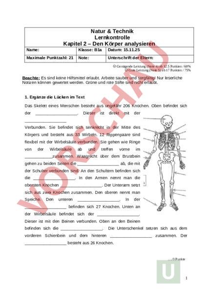 Natur Technik Lernkontrolle Kapitel 2 – Den Körper analysieren Name: Klasse: B1a Datum: 15.11.25 Maximale Punktzahl: 21 Note: Unterschrift der Eltern: Genügende Leistung (Note 4) ab 12.5 Punkten 60%Genügende Genügende Leistung (Note 4) ab 12.5 Punkten 60%Leistung Genügende Leistung (Note 4) ab 12.5 Punkten 60%(Note Genügende Leistung (Note 4) ab 12.5 Punkten 60%4) Genügende Leistung (Note 4) ab 12.5 Punkten 60%ab Genügende Leistung (Note 4) ab 12.5 Punkten 60%12.5 Genügende Leistung (Note 4) ab 12.5 Punkten 60%Punkten Genügende Leistung (Note 4) ab 12.5 Punkten 60%/ Genügende Leistung (Note 4) ab 12.5 Punkten 60%60% Genügende Leistung (Note 4) ab 12.5 Punkten 60%Gute Genügende Leistung (Note 4) ab 12.5 Punkten 60%Leistung Genügende Leistung (Note 4) ab 12.5 Punkten 60%(Note Genügende Leistung (Note 4) ab 12.5 Punkten 60%5) Genügende Leistung (Note 4) ab 12.5 Punkten 60%ab Genügende Leistung (Note 4) ab 12.5 Punkten 60%17 Genügende Leistung (Note 4) ab 12.5 Punkten 60%Punkten Genügende Leistung (Note 4) ab 12.5 Punkten 60%/ Genügende Leistung (Note 4) ab 12.5 Punkten 60%75% Genügende Leistung (Note 4) ab 12.5 Punkten 60% Beachte: Es sind keine Hilfsmittel erlaubt. Arbeite sauber und sorgfältig! Nur leserliche Notizen können gewertet werden. Grüne und rote Stifte sind nicht erlaubt. 1. Ergänze die Lücken im Text Das Skelett eines Menschen besteht aus ungefähr 206 Knochen. Oben befindet sich der . Dieser ist direkt mit der Verbunden. Sie befindet sich senkrecht in der Mitte des Körpers und besteht aus 33 Wirbeln. 12 Rippenpaare sind flexibel mit der Wirbelsäule verbunden. Sie gehen wie Ringe von der Wirbelsäule ab und treffen vorne im zusammen. Waagrecht über dem Brustbein gehen zu beiden Seiten die ab, die mit der Schulter verbunden sind. An den Schultern befinden sich die . In den Armen nennt man die obersten Knochen . Der Unterarm setzt sich aus zwei Knochen zusammen. Den oberen nennt man Speiche. Den unteren . In der befinden sich 27 Knochen. Unten an der Wirbelsäule befindet sich der . Dieser ist mit den Beinen verbunden. Oben an den Beinen befinden sich die . Die Unterschenkel setzen sich aus dem vorderen Schienbein und dem hinteren zusammen. Der besteht aus 26 Knochen. ./3 Genügende Leistung (Note 4) ab 12.5 Punkten 60%Punkte 1 2. Ergänze die Lücken im Text: Genügende Leistung (Note 4) ab 12.5 Punkten 60% Das stützt den Körper von innen. Knochen sind durch fest und durch biegsam zugleich. ./1.5 Genügende Leistung (Note 4) ab 12.5 Punkten 60%Punkte 3. Nenne zwei Gelenksformen mit Beispiel: ./2 Genügende Leistung (Note 4) ab 12.5 Punkten 60%Punkte 4. Erkläre das Gegenspielerprinzip am Arm. ./1.5 Genügende Leistung (Note 4) ab 12.5 Punkten 60%Punkte 2 5. Erklären den Begriffe Stoffwechsel und nenne vier zentrale Vorgänge des Stoffwechsels ./2 Genügende Leistung (Note 4) ab 12.5 Punkten 60%Punkte 6. Blut Bestandteile: ./2 Genügende Leistung (Note 4) ab 12.5 Punkten 60%Punkte 3 7. Erkläre, wie das Herz-Kreislauf-System funktioniert ./4 Genügende Leistung (Note 4) ab 12.5 Punkten 60%Punkte 8. Nenne drei Risikofaktoren für einen Herzinfarkt und analysiere, wie jeder dieser Faktoren die Herzkranzgefässe oder das Herz belastet. ./3 Genügende Leistung (Note 4) ab 12.5 Punkten 60%Punkte 9. Beschreibe die verschiedenen Entsorgungssysteme unseres Körpers und ihre Funktionen ./2 Genügende Leistung (Note 4) ab 12.5 Punkten 60%Punkte 4