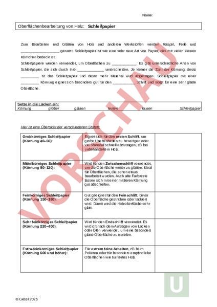 Name: Oberflächenbearbeitung von Holz: Schleifpapier Zum Bearbeiten und Glätten von Holz und anderen Werkstoffen werden Raspel, Feile und genutzt. Schleifpapier ist wie eine sehr raue Art von Papier, das mit vielen kleinen Körnchen bedeckt ist. Schleifpapiere werden verwendet, um Oberflächen zu . Es gibt unterschiedliche Arten von Schleifpapier, die sich durch ihre unterscheiden. Je kleiner die Zahl der Körnung, desto ist das Schleifpapier und desto mehr Material wird abgetragen. Schleifpapier mit einer Körnung eignet sich besonders gut für den Schliff und sorgt für eine sehr glatte Oberfläche. Setze in die Lücken ein: Körnung gröber glätten feinen letzten Hier ist eine Übersicht der verschiedenen Stufen: Grobkörniges Schleifpapier (Körnung 40–60): Eignet sich für den ersten Schliff, um grobe Unebenheiten zu beseitigen oder viel Material schnell abzutragen, zB bei unbehandeltem Holz. Mittelkörniges Schleifpapier (Körnung 80–120): Wird für den Zwischenschliff verwendet, um die Oberfläche weiter zu glätten. Ideal für Oberflächen, die schon etwas bearbeitet wurden. Auch alte Farbreste lassen sich mit einer mittleren Körnung gut abschleifen. Feinkörniges Schleifpapier (Körnung 150–180): Gut geeignet für den Feinschliff, bevor die Oberfläche gestrichen oder lackiert wird. Damit wird die Holzoberfläche sehr glatt. Sehr feinkörniges Schleifpapier (Körnung 220–400): Wird für den Endschliff verwendet. Es wird oft nach dem Auftragen von Lacken oder Ölen verwendet, um eine besonders glatte Oberfläche zu erzielen. Extra-feinkörniges Schleifpapier (Körnung 600 und höher): Für extrem feine Arbeiten, zB beim Polieren oder für besonders empfindliche Oberflächen wie furniertes Holz. Gessl 2025 Schleifpapier