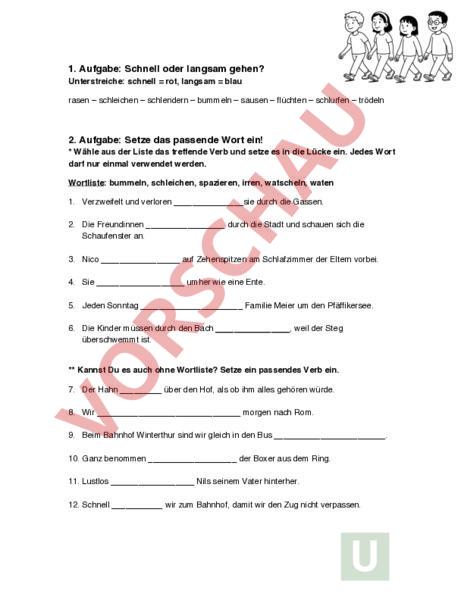 1. Aufgabe: Schnell oder langsam gehen? Unterstreiche: schnell rot, langsam blau rasen – schleichen – schlendern – bummeln – sausen – flüchten – schlurfen – trödeln 2. Aufgabe: Setze das passende Wort ein! Wähle aus der Liste das treffende Verb und setze es in die Lücke ein. Jedes Wort darf nur einmal verwendet werden. Wortliste: bummeln, schleichen, spazieren, irren, watscheln, waten 1. Verzweifelt und verlorensie durch die Gassen. 2. Die Freundinnen durch die Stadt und schauen sich die Schaufenster an. 3. Nico auf Zehenspitzen am Schlafzimmer der Eltern vorbei. 4. Sie umher wie eine Ente. 5. Jeden Sonntag Familie Meier um den Pfäffikersee. 6. Die Kinder müssen durch den Bach , weil der Steg überschwemmt ist. ** Kannst Du es auch ohne Wortliste? Setze ein passendes Verb ein. 7. Der Hahn über den Hof, als ob ihm alles gehören würde. 8. Wir morgen nach Rom. 9. Beim Bahnhof Winterthur sind wir gleich in den Bus . 10. Ganz benommen der Boxer aus dem Ring. 11. Lustlos Nils seinem Vater hinterher. 12. Schnell wir zum Bahnhof, damit wir den Zug nicht verpassen. LÖSUNGEN 1. Aufgabe: langsam oder schnell? Unterstreiche: rot schnell à rasen, sausen, flüchten blau langsam à schleichen, schlendern, bummeln, schlurfen, trödeln rasen – schleichen – schlendern – bummeln – sausen – flüchten – schlurfen – trödeln 2. Aufgabe: Setze das passende Wort ein! Wähle aus der Liste das treffende Verb und setze es in die Lücke ein. Jedes Wort darf nur einmal verwendet werden. Wortliste: bummeln, schleichen, spazieren, irren, watscheln, waten 1. Verzweifelt und verloren irrt sie durch die Gassen. 2. Die Freundinnen bummeln durch die Stadt und schauen sich die Schaufenster an. 3. Nico schleicht auf Zehenspitzen am Schlafzimmer der Eltern vorbei. 4. Sie watschelt umher wie eine Ente. 5. Jeden Sonntag spaziert Familie Meier um den Pfäffikersee. 6. Die Kinder müssen durch den Bach waten, weil der Steg überschwemmt ist. ** Kannst Du es auch ohne Wortliste? Setze ein passendes Verb ein. à Beispiele 1. Der Hahn stolziert über den Hof, als ob ihm alles gehören würde. 2. Wir reisen (fahren, fliegen) morgen nach Rom. 3. Beim Bahnhof Winterthur sind wir gleich in den Bus gestiegen, umgestiegen 4. Ganz benommen taumelt, torkelt, schwankt, stolpert der Boxer aus dem Ring. 5. Lustlos schlurft, trottet, zottelt, stiefelt, Nils seinem Vater hinterher. 6. Schnell eilen, hetzen (rennen), hasten, sausen, jagen, düsen wir zum Bahnhof damit wir den Zug nicht verpassen.