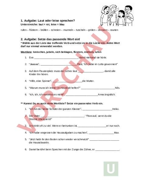 1. Aufgabe: Laut oder leise sprechen? Unterstreiche: laut rot, leise blau rufen – flüstern – brüllen – schreien – murmeln – tuscheln – grölen – donnern – raunen 2. Aufgabe: Setze das passende Wort ein! Wähle aus der Liste das treffende Verb und setze es in die Lücke ein. Jedes Wort darf nur einmal verwendet werden. Wortliste: kreischen, jubeln, sich beklagen, flüstern, stottern, rufen 1. Eva, damit niemand sie hörte. 2. Jaaaaa, Paul, ich habe im Lotto gewonnen! 3. Auf dem Pausenplatz muss der Lehrer laut , damit alle Kinder ihn hören. 4. Hilfe, eine Spinne!,die Mutter. 5. Warum muss ich immer im Haushalt helfen? Nils. 6. Ich, ich, ich wwweiss es nicht!,Anna ängstlich. ** Kannst Du es auch ohne Wortliste? Setze ein passendes Verb ein. 1. Ich bin der beste Schüler der ganzen Klasse!,Heiko. 2. Der Vater: Pass auf, wenn du die Strasse überquerst! 3. Urs trinkt oft zu viel. Wenn er betrunken ist, er nur noch. 4. Ich habe vergessen die Hausaufgaben zu machen, Max. 5. Jetzt habt ihr den Boden schon wieder verschmutzt! die Hausabwartin. 6. Daniel berührt beim Sprechen mit der Zunge die Zähne, er. LÖSUNGEN 1. Aufgabe: Laut oder leise sprechen? Unterstreiche: laut rot rufen, brüllen, schreien, grölen, donnern leise blau flüstern, murmeln, tuscheln, raunen 2. Aufgabe: Setze das passende Wort ein! Wähle aus der Liste das treffende Verb und setze es in die Lücke ein. Jedes Wort darf nur einmal verwendet werden. Wortliste: kreischen, jubeln, sich beklagen, flüstern, stottern, rufen 7. Eva flüstert, damit niemand sie hörte. 8. Jaaaaa, jubelt Paul, ich habe im Lotto gewonnen! 9. Auf dem Pausenplatz muss der Lehrer laut rufen damit alle Kinder ihn hören. 10. Hilfe, eine Spinne!, kreischt die Mutter. 11. Warum muss ich immer im Haushalt helfen? beklagt sich Nils. 12. Ich, ich, ich wwweiss es nicht!, stottert Anna ängstlich. ** Kannst Du es auch ohne Wortliste? Setze ein passendes Verb ein. Lösungsbeispiele 7. Ich bin der beste Schüler der ganzen Klasse!, prahlt, blufft, protzt Heiko. Auch: angeben, sich brüsten oder lügen, flunkert, schwindelt. 8. Der Vater mahnt, fleht, bittet, Pass auf, wenn du die Strasse überquerst! 9. Urs trinkt oft zu viel. Wenn er betrunken ist, lallt er nur noch. 10. Ich habe vergessen die Hausaufgaben zu machen, gesteht, beichtet Max. Auch: zugeben 11. Jetzt habt ihr den Boden schon wieder verschmutzt! schimpft, rügt, tadelt, stönt, die Hausabwartin. 12. Daniel berührt beim Sprechen mit der Zunge die Zähne, er lispelt.