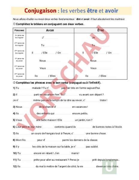 Nous allons étudier ou revoir deux verbes fondamentaux être et avoir. Il faut absolument les maîtriser. Complétez le tableau en conjuguant ces deux verbes. PERSONNE AVOIR ÊTRE 1ère personne du singulier J Je 2ème personne du singulier Tu Tu 3ème personne du singulier Il Elle On Il Elle On 1ère personne du pluriel Nous Nous 2ème personne du pluriel Vous Vous 3ème personne du pluriel Ils Elles Ils Elles Complétez les phrases avec le bon verbe (conjugué ou à linfinitif). 1) Tu malade Tu n pas lair très en forme aujourdhui. 2) Il parti en vacances hier. Tu l_ vu avant son départ Je n même pas eu le temps de lui dire au revoir, c triste 3) Nous de la chance d_ en vacances 4) Ils des enfants qui encore petits. 5) Vous une belle maison Elle un jardin, non 6) Leur père et leur mère contents quand ils de bonnes notes à lécole. 7) Ils un cours de français tout à lheure, c une bonne chose. 8) Mon fils peur d parmi les derniers de la classe. 9) Il les clés de la maison sur la table, je n pas oublié. 10) Tu encore en retard Jen marre 11) Tu prête pour aller au restaurant Perso je prêt depuis longtemps 12) Ils du mal à mettre de largent de côté, la vie devenue très chère.