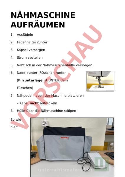 NÄHMASCHINE AUFRÄUMEN 1. Ausfädeln 2. Fadenhalter runter 3. Kapsel versorgen 4. Strom abstellen 5. Nähtisch in der Nähmaschinenhülle versorgen 6. Nadel runter, Füsschen runter (Filzunterlage ist UNTER dem Füsschen) 7. Nähpedal neben der Maschine platzieren – Kabel nicht aufwickeln 8. Hülle über die Nähmaschine stülpen So wie hier: