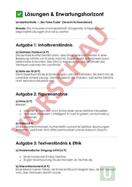 Lösungen Erwartungshorizont Lernzielkontrolle – „Der Fake-Code (Severin Schwendener) Hinweis: Die Antworten sind beispielhaft. Sinngemäss richtige und gut begründete Lösungen sind voll zu werten. Aufgabe 1: Inhaltsverständnis a) Zentrales Problem (6 P) Der zentrale Konflikt besteht darin, dass Emre seine Unsicherheit in einer Beziehung mithilfe von KI lösen möchte. Dabei ersetzt er Ehrlichkeit durch berechnete Antworten. Dies führt zu Manipulation und gefährdet das Vertrauen zwischen ihm und Emilia. b) Rolle der KI (4 P) Die KI beeinflusst Emres Entscheidungen und sein Verhalten. Sie dient ihm als scheinbar sichere Lösung, verstärkt jedoch das Problem, weil echte Gefühle nicht technisch steuerbar sind. Aufgabe 2: Figurenanalyse a) Emre (6 P) Beispiel: • • Unsicher: Er traut sich nicht, Emilia direkt seine Gefühle mitzuteilen. Technisch interessiert intelligent: Er nutzt KI gezielt, um Kontrolle zu gewinnen. b) Emilia (4 P) Emilia erwartet Ehrlichkeit, Authentizität und echte Gefühle. Spannungen entstehen, weil Emre nicht offen kommuniziert und sie dadurch täuscht. Aufgabe 3: Textverständnis Ethik a) Problematischer Umgang mit KI (6 P) • • Emre manipuliert Emilias Gefühle. Er gibt Verantwortung für sein Handeln an Technik ab. b) Erkenntnismoment (4 P) Emre erkennt seinen Fehler, als Emilia enttäuscht reagiert bzw. als ihm bewusst wird, dass Vertrauen zerstört wurde. Aufgabe 4: Stellungnahme (10 P) Bewertungskriterien: • • • • Klare Position (2 P) Zwei nachvollziehbare Argumente (4 P) Logischer Aufbau (2 P) Sprache Ausdruck (2 P) Beispielinhalt: KI kann unterstützen, ersetzt aber keine Empathie, Verantwortung und echte Kommunikation. Aufgabe 5: Kreatives Schreiben (10 P) Bewertungskriterien: • • • Bezug zur Figur Emre (3 P) Erkennbare innere Konflikte (3 P) Kreativität Ausdruck (4 P) Beispiel: Warum fühlt sich das alles plötzlich falsch an? Ich wollte doch nur, dass alles klappt. Aber diese Worte sind nicht meine Vielleicht muss ich endlich selbst den Mut haben, ehrlich zu sein. Notenvorschlag (anpassbar) • • • • • 45–50 Note 6 40–44 Note 5.5 35–39 Note 5 30–34 Note 4.5 25–29 Note 4 Kompetenzen: Textverständnis Figurenanalyse Medienethik (KI) Argumentatives kreatives Schreiben