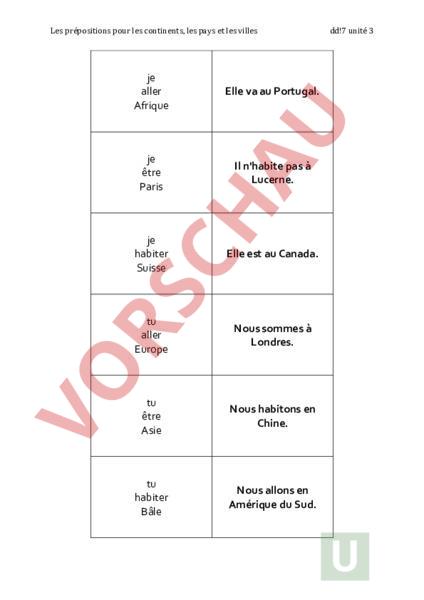Les prépositions pour les continents, les pays et les villes je aller Afrique Elle va au Portugal. je être Paris Il nhabite pas à Lucerne. je habiter Suisse Elle est au Canada. tu aller Europe Nous sommes à Londres. tu être Asie Nous habitons en Chine. tu habiter Bâle Nous allons en Amérique du Sud. dd!7 unité 3 Les prépositions pour les continents, les pays et les villes elle aller Portugal Je vais en Afrique. il ne pas habiter Lucerne Je suis à Paris. elle être Canada Jhabite en Suisse. nous être Londres Tu vas en Europe. nous habitons Chine Tu es en Asie. nous aller Amérique du Sud Tu habites à Bâle. dd!7 unité 3 Les prépositions pour les continents, les pays et les villes elles être Amérique du Nord Elle ne va pas en Allemagne. ils habiter Angleterre Il habite à Copenhague au Danemark. elles être États-Unis Je suis au Brésil. ils aller New York Nous ne sommes pas en France. nous être Sydney Nous habitons en Italie. ils aller Australie Ils vont à Berlin, en Allemagne. dd!7 unité 3 Les prépositions pour les continents, les pays et les villes elle ne pas aller Allemagne Elles sont en Amérique du Nord. il habiter Copenhague, Danemark Ils habitent en Angleterre. je être Brésil Elles sont aux ÉtatsUnis. nous ne pas être France Ils vont à New York. nous habitons Italie Nous sommes à Sydney. ils aller Berlin, Allemagne Ils vont en Australie. dd!7 unité 3 Les prépositions pour les continents, les pays et les villes elle habiter Silenen La classe est en Suisse, à Genève. je habiter Bürglen Il est aux Émirats arabes unis. Moi et ma famille habiter Altdorf Mme Dupont nhabite plus à Soleure. nous être Londres Ma copine va en Asie. toi et ton frère aller Chine Les élèves ne sont plus à Rome en Italie. ils ne pas aller Russie Ils sont en Russie, à Moscou. dd!7 unité 3 Les prépositions pour les continents, les pays et les villes la classe être Suisse, Genève Elle habite à Silenen. il être Émirats arabes unis Jhabite à Bürglen. Mme Dupont ne plus habiter Soleure (Solothurn) Moi et ma famille (,nous) habitons à Altdorf. Ma copine aller Asie Nous sommes à Londres. Les élèves ne plus être Rome, Italie Toi et ton frère, vous allez en Chine? ils être Russie, Moscou Ils ne vont pas en Russie. dd!7 unité 3
