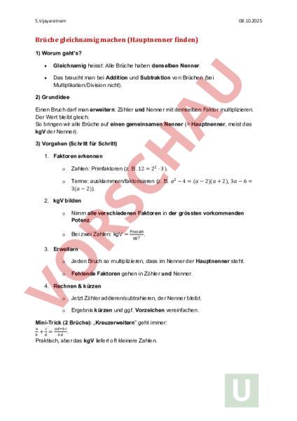 S.Vijayaratnam 08.10.2025 Brüche gleichnamig machen (Hauptnenner finden) 1) Worum gehts? • Gleichnamig heisst: Alle Brüche haben denselben Nenner. • Das braucht man bei Addition und Subtraktion von Brüchen (bei Multiplikation/Division nicht). 2) Grundidee Einen Bruch darf man erweitern: Zähler und Nenner mit demselben Faktor multiplizieren. Der Wert bleibt gleich. So bringen wir alle Brüche auf einen gemeinsamen Nenner ( Hauptnenner, meist das kgV der Nenner). 3) Vorgehen (Schritt für Schritt) 1. Faktoren erkennen Zahlen: Primfaktoren (z. B. 12 22 3). Terme: ausklammern/faktorisieren (z. B.