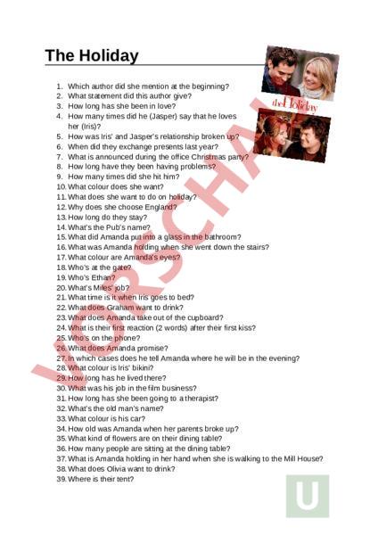 The Holiday 1. 2. 3. 4. Which author did she mention at the beginning? What statement did this author give? How long has she been in love? How many times did he (Jasper) say that he loves her (Iris)? 5. How was Iris and Jaspers relationship broken up? 6. When did they exchange presents last year? 7. What is announced during the office Christmas party? 8. How long have they been having problems? 9. How many times did she hit him? 10. What colour does she want? 11. What does she want to do on holiday? 12. Why does she choose England? 13. How long do they stay? 14. Whats the Pubs name? 15. What did Amanda put into glass in the bathroom? 16. What was Amanda holding when she went down the stairs? 17. What colour are Amandas eyes? 18. Whos at the gate? 19. Whos Ethan? 20. Whats Miles job? 21. What time is it when Iris goes to bed? 22. What does Graham want to drink? 23. What does Amanda take out of the cupboard? 24. What is their first reaction (2 words) after their first kiss? 25. Whos on the phone? 26. What does Amanda promise? 27. In which cases does he tell Amanda where he will be in the evening? 28. What colour is Iris bikini? 29. How long has he lived there? 30. What was his job in the film business? 31. How long has she been going to therapist? 32. Whats the old mans name? 33. What colour is his car? 34. How old was Amanda when her parents broke up? 35. What kind of flowers are on their dining table? 36. How many people are sitting at the dining table? 37. What is Amanda holding in her hand when she is walking to the Mill House? 38. What does Olivia want to drink? 39. Where is their tent? 40. What did he call his daughter when she repeated that Amanda had to lie down (adjective)? 41. Where were the children last weekend? 42. How many people does Iris greet when she is leaving home? 43. Where is Graham when he is calling Iris? 44. Whats the dogs name? 45. What day did Iris and Miles meet? 46. What is Amanda trying to do while walking on field? 47. Why does Miles write song for Arthur? 48. How does Graham call himself and his two daughters? 49. What would have been the obvious response Graham was expecting? 50. What are Iris and Miles eating? 51. Where does Jasper propose to go to with Iris? 52. What kind of plant is hanging on Iris door? 53. Whats Arthurs surname? 54. What does Silvester mean in English? 55. What does challenge you mean in German?