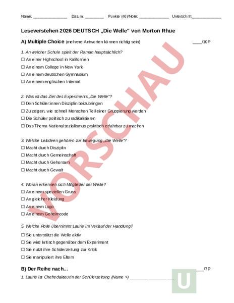 Name: Datum: Punkte (46)/Note: Unterschrift Leseverstehen 2026 DEUTSCH „Die Welle von Morton Rhue A) Multiple Choice (mehrere Antworten können richtig sein) /10P 1. An welcher Schule spielt der Roman hauptsächlich? An einer Highschool in Kalifornien An einem College in New York An einem deutschen Gymnasium An einem englischen Internat 2. Was ist das Ziel des Experiments „Die Welle? Den Schüler:innen Disziplin beizubringen Zu zeigen, wie schnell Menschen Teil einer Gruppierung werden Die Schüler politisch zu radikalisieren Das Thema Nationalsozialismus praktisch erfahrbar zu machen 3. Welche Leitideen gehören zur Bewegung „Die Welle? Macht durch Disziplin Macht durch Gemeinschaft Macht durch Gehorsam Macht durch Gewalt 4. Woran erkennen sich Mitglieder der Welle? An einem speziellen Gruss An gleicher Kleidung An einem Logo An einem Geheimcode 5. Welche Rolle übernimmt Laurie im Verlauf der Handlung? Sie unterstützt die Welle aktiv Sie wird kritisch gegenüber dem Experiment Sie nutzt ihre Schülerzeitung zur Kritik Sie manipuliert ihre Eltern B) Der Reihe nach. 1. Laurie ist Chefredakteurin der Schülerzeitung (Name ) /7P 2. Warum zeigte Mr. Ross der Klasse den Film über den 2. Weltkrieg? Der Film sollte die Klasse aufrütteln und zum Nachdenken bringen. Die Lernenden mussten danach Fragen zum Film beantworten. Die Lernenden sollten schockiert sein und Angst bekommen. Der Film sollte aufzeigen, wie grausam eine Gruppe sein kann, wenn sie gut organisiert ist. 3. Welches sind gemäss David die Gründe, dass seine Footballmannschaft oft verliert? Sie haben zu viele untalentierte Spieler. Der Trainer kennt sich zu wenig mit Taktik aus. Die Spieler treten nicht als einheitliche Mannschaft aus. Es gibt zu viele Einzelkämpfer in der Mannschaft. 4. Christy Ross sieht die Welle eher mit kritischen Augen. Was sind die Gründe? Sie denkt, Schüler:innen denken weniger, wenn jemand ihnen alles abnimmt. Sie glaubt, Schüler:innen würden so weniger für die Schule arbeiten. Sie denkt, Mitglieder könnten sich für etwas Besseres halten als die anderen Kinder. Sie glaubt, dass Ben selber zum Versuchskaninchen in seinem Projekt werden könnte. 5. Warum finden viele Schüler:innen die Welle gut? Sie denken, dass mehr Disziplin würde allen gut tun. dass sie ein guter Gegensatz zur langweiligen demokratischen Haltung ist. dass sie gut ist, weil es nicht mehr viele kleine Gruppen gibt sondern alle zusammengehören. dass sie gut ist, weil man jetzt immer offen seine Meinung sagen kann dass sie gut ist, weil es viel einfacher ist, wenn man nicht selber Entscheidungen treffen muss. 6. Laurie bekommt einen Brief ohne Absender? Warum steht da kein Name? (0,5) 7. In der Sonderausgabe der Zeitung erscheint ein Artikel darüber, dass die Welle schlechte Aktionen auslöste. Ein Schüler wurde verprügelt, andere werden eingeschüchtert. David kann diese negativen Zeilen nicht verstehen. Plötzlich ändert er seine positive Meinung jedoch. Warum? Beschreibe kurz und exakt, wie es dazu kommt. C) Fragen zum Nachdenken 6. Beschreibe die Entwicklung von Ben Ross im Verlauf des Experiments./3 7. Welche Veränderungen beobachtet Laurie bei ihren Mitschülern? Nenne zwei./2 8. Mit welcher Figur konntest du dich am ehesten identifizieren? Begründe kurz./3 9. Warum ist das Ende des Experiments für viele Schüler:innen schockierend?/2 10. Robert Billings hat sich im Laufe der Geschichte verändert. Am Schluss des Buches weint er. Beschreibe Roberts Veränderung mit vier verschiedenen treffenden Aussagen./2 Vor dem Experiment_ Während dem Experiment 1 Während dem Experiment 2 Nach dem Experiment D) Vergleich mit dem Nationalsozialismus 10. Nenne drei Parallelen zwischen der Welle und dem Nationalsozialismus./3 11. Erkläre, wie Symbole und Rituale sowohl in der Welle als auch im Nationalsozialismus eingesetzt werden./3 12. Warum ist es gefährlich, wenn Menschen Kritik Andersdenkende nicht mehr zulassen? Beziehe dich auf das Buch./3 E) Fragen zum Transfer 13. Hätte das Experiment auch ohne Ben Ross anfängliche Begeisterung funktioniert? Begründe deine Meinung mit Bezug auf das Buch./2 14. Und heute? Übertrage die Botschaft des Romans auf die heutige Zeit. Wo könnten ähnliche Mechanismen auftreten? Beschreibe1-2 Situationen sorgfältig und verständlich/4 15. Was ist deiner Meinung nach die zentrale Warnung des Romans? Formuliere sie in einem deutlichen Satz. /2