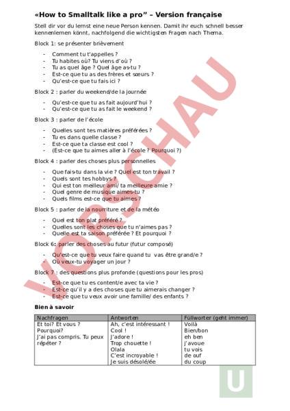 «How to Smalltalk like pro – Version française Stell dir vor du lernst eine neue Person kennen. Damit ihr euch schnell besser kennenlernen könnt, nachfolgend die wichtigsten Fragen nach Thema. Block 1: se présenter brièvement Comment tu tappelles Tu habites où? Tu viens doù Tu as quel âge Quel âge as-tu Est-ce que tu as des frères et sœurs Quest-ce que tu fais ici Block 2 parler du weekend/de la journée Quest-ce que tu as fait aujourdhui Quest-ce que tu as fait le weekend Block 3 parler de lécole Quelles sont tes matières préférées Tu es dans quelle classe Est-ce que ta classe est cool (Est-ce que tu aimes aller à lécole Pourquoi ?) Block 4 parler des choses plus personnelles Que fais-tu dans la vie Quel est ton travail Quels sont tes hobbys Qui est ton meilleur ami/ ta meilleure amie Quel genre de musique aimes-tu Quels films est-ce que tu aimes Block 5 parler de la nourriture et de la météo Quel est ton plat préféré Quelles sont les choses que tu naimes pas Quelle est ta saison préférée Et pourquoi Block 6: parler des choses au futur (futur composé) Quest-ce que tu veux faire quand tu vas être grand/e Où veux-tu voyager un jour Block 7 des questions plus profonde (questions pour les pros) Est-ce que tu es content/e avec ta vie Est-ce quil a des choses que tu aimerais changer Est-ce que tu veux avoir une famille/ des enfants Bien à savoir Nachfragen Et toi? Et vous Pourquoi? Jai pas compris. Tu peux répéter Antworten Ah, cest intéressant Cool Jadore Trop chouette Olala Cest incroyable Je suis désolé/ée Füllworter (geht immer) Voilà Bien/bon eh ben javoue tu vois de ouf du coup