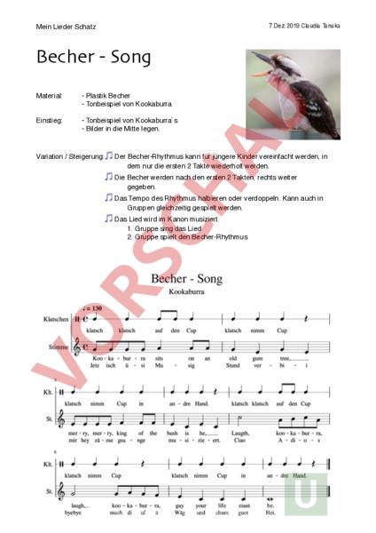 Mein Lieder Schatz 7.Dez. 2019 Claudia Tanaka Becher Song Material: Plastik Becher Tonbeispiel von Kookaburra Einstieg: Tonbeispiel von Kookaburras Bilder in die Mitte legen. Variation Steigerung: