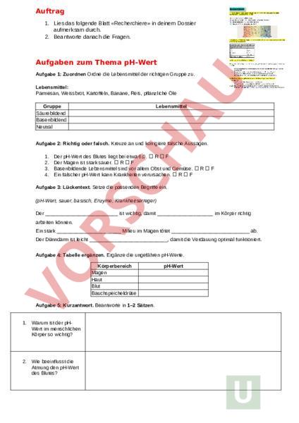 Auftrag 1. Lies das folgende Blatt «Recherchiere» in deinem Dossier aufmerksam durch. 2. Beantworte danach die Fragen. Aufgaben zum Thema pH-Wert Aufgabe 1: Zuordnen Ordne die Lebensmittel der richtigen Gruppe zu. Lebensmittel: Parmesan, Weissbrot, Kartoffeln, Banane, Reis, pflanzliche Öle Gruppe Säurebildend Basenbildend Neutral Lebensmittel Aufgabe 2: Richtig oder falsch. Kreuze an und korrigiere falsche Aussagen. 1. 2. 3. 4. Der pH-Wert des Blutes liegt bei etwa 6,0. Der Magen ist stark sauer. Basenbildende Lebensmittel sind vor allem Obst und Gemüse. Ein falscher pH-Wert kann Krankheiten verursachen. Aufgabe 3: Lückentext. Setze die passenden Begriffe ein. (pH-Wert, sauer, basisch, Enzyme, Krankheitserreger) Der ist wichtig, damit im Körper richtig arbeiten können. Ein stark Milieu im Magen tötet ab. Der Dünndarm ist leicht , damit die Verdauung optimal funktioniert. Aufgabe 4: Tabelle ergänzen. Ergänze die ungefähren pH-Werte. Körperbereich Magen Haut Blut Bauchspeicheldrüse Aufgabe 5: Kurzantwort. Beantworte in 1–2 Sätzen. 1. Warum ist der pHWert im menschlichen Körper so wichtig? 2. Wie beeinflusst die Atmung den pH-Wert des Blutes? pH-Wert Aufgabe 6: Die Nieren: Erkläre kurz die Aufgabe der Nieren bei der Regulation des pH-Werts.