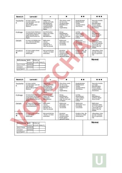 Bereich Lernziel • •• ••• Sauberke it Ich kann sauber Ausschneiden und mit dem Bleistift gleichmässig stark drücken. Willkürliche dunkle und helle Bleistiftspuren. Unregelmässig ausgeschnitten oder Risse im Papier. Ohne Risse meist auf der Linie ausgeschnitten. Bleistiftdruck meist regelmässig. Regelmässiger Bleistiftdruck. Sauber ausgeschnitten ohne Risse. Bewusste dunkle und helle Bleistiftstellen. Immer sauber ausgeschnitten, ohne Risse. Frottage Ich kann beim Frottieren mit leichtem Druck eine regelmässige Fläche bilden ohne Löcher im Papier. Durchlöchertes Papier mit vielen deutlichen Bleistiftlinien. Einige Bleistiftlinien sichtbar. Nicht mehr als ein Loch im Papier. Leichte Bleistiftlinien noch sichtbar. Papier ohne Löcher. Keine Bleistiftlinien sichtbar. Papier ohne Löcher. Details Ich kann ein Blattwesen aus vielen Einzelteilen zusammenbauen. Blattwesen schwer erkennbar. Weniger als 5 Teile verwendet. Blattwesen erkennbar. 5-8 Einzelteile verwendet. Blattwesen erkennbar. 9-12 Einzelteile verwendet. Blattwesen erkennbar. Mehr als 12 Einzelteile verwendet und kleine Teile für Details. Kreativit ät Ich kann eigene Ideen in mein Werk einbringen. Kein persönlicher «Touch» im Werk erkennbar. Einzelnes Element, dass wenige andere Kinder gleich gemacht haben. Kreative Idee, die deutlich im Werk heraussticht. «Neuartige» Idee, die kein anderes Kind so gemacht hat. Name: Bereich Lernziel • •• ••• Sauberke it Ich kann sauber Ausschneiden und mit dem Bleistift gleichmässig stark drücken. Willkürliche dunkle und helle Bleistiftspuren. Unregelmässig ausgeschnitten oder Risse im Papier. Ohne Risse meist auf der Linie ausgeschnitten. Bleistiftdruck meist regelmässig. Regelmässiger Bleistiftdruck. Sauber ausgeschnitten ohne Risse. Bewusste dunkle und helle Bleistiftstellen. Immer sauber ausgeschnitten, ohne Risse. Frottage Ich kann beim Frottieren mit leichtem Druck eine regelmässige Fläche bilden ohne Löcher im Papier. Durchlöchertes Papier mit vielen deutlichen Bleistiftlinien. Einige Bleistiftlinien sichtbar. Nicht mehr als ein Loch im Papier. Leichte Bleistiftlinien noch sichtbar. Papier ohne Löcher. Keine Bleistiftlinien sichtbar. Papier ohne Löcher. Details Ich kann ein Blattwesen aus vielen Einzelteilen zusammenbauen. Blattwesen schwer erkennbar. Weniger als 5 Teile verwendet. Blattwesen erkennbar. 5-8 Einzelteile verwendet. Blattwesen erkennbar. 9-12 Einzelteile verwendet. Blattwesen erkennbar. Mehr als 12 Einzelteile verwendet und kleine Teile für Details. Kreativit ät Ich kann eigene Ideen in mein Werk einbringen. Kein persönlicher «Touch» im Werk erkennbar. Einzelnes Element, dass wenige andere Kinder gleich gemacht haben. Kreative Idee, die deutlich im Werk heraussticht. «Neuartige» Idee, die kein anderes Kind so gemacht hat. Name:
