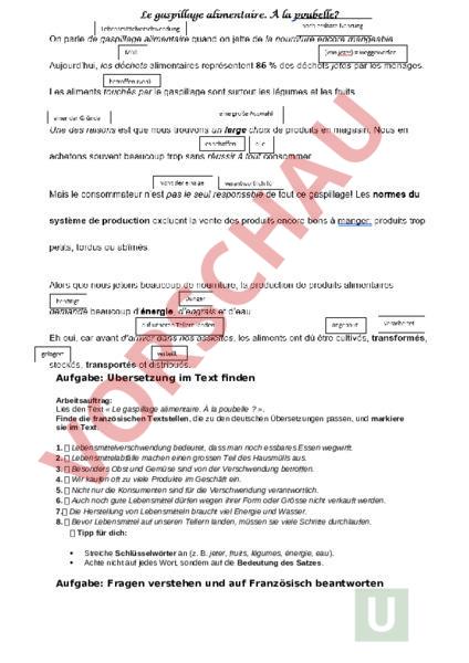 Aufgabe: Übersetzung im Text finden Arbeitsauftrag: Lies den Text « Le gaspillage alimentaire. À la poubelle ». Finde die französischen Textstellen, die zu den deutschen Übersetzungen passen, und markiere sie im Text. 1.