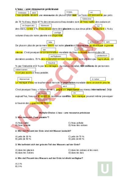 Leau – une ressource précieuse Trinkwass knapp, selten wird Leau potable devient une ressource de plus en plus rare. La Terre ist estbedeckt recouverte par près Salzwasse de 70 deau. Mais 97 des ressources deau totales sont de leau salée des océans et im Gegensatz zu Süsswass er nur des mers, contre 3 deau douce dans des glaciers ou aux deux pôles. Seulement 1 du verfügb volume deau de notre planète est disponible. entwickelt lebe sehr De plus en plus de personnes vivent sur notre planète et léconomie se développe à grande hat sich der vitesse. Cest pourquoi la consommation mondiale de leau doublé au cours des 30 Landwirtsch verfügbares dernières années. 70 des ressources en eau disponibles sont utilisées par lagriculture, 22 Haushal par lindustrie et 8 par les ménages. Au niveau mondial, 884 millions de personnes haben keinen nont pas accès à leau potable. Wasserman gel in naher Le manque deau va toucher deux tiers de la population mondiale dans un avenir proche. wird wichtiger Cest pourquoi leau, « lélixir de vie », gagne en importance au niveau international. Déjà ihr der Grund aujourdhui, leau est la raison de nombreux conflits. Son manque pourrait même provoquer Wasserkrie ge à lavenir des « guerres de leau ». Multiple-Choice: Leau – une ressource précieuse 1. Was bedeutet „leau potable? A) leau salée B) leau potable C) leau polluée D) leau des océans 2. Wie viel Prozent der Erde sind mit Wasser bedeckt? A) près de 30 B) près de 50 C) près de 70 D) près de 90 3. Wo befindet sich der grösste Teil des Wassers auf der Erde? A) dans les glaciers B) dans les rivières C) dans les océans et les mers D) dans les lacs 4. Wie viel Prozent des Wassers auf der Erde ist direkt verfügbar? A) 1 B) 3 C) 22 D) 70 5. Warum ist der Wasserverbrauch gestiegen? A) Parce que leau est gratuite B) Parce que léconomie se développe rapidement C) Parce que les océans disparaissent D) Parce que les ménages utilisent moins deau 6. Wer verbraucht am meisten Wasser? A) les ménages B) lindustrie C) lagriculture D) les villes 7. Wie viele Menschen haben keinen Zugang zu Trinkwasser? A) 88 millions B) 184 millions C) 884 millions D) 1 milliard 8. Wen wird Wassermangel in Zukunft betreffen? A) un tiers de la population mondiale B) la moitié de la population mondiale C) deux tiers de la population mondiale D) toute la population mondiale 9. Warum wird Wasser international immer wichtiger? A) Parce quil est facile à trouver B) Parce quil devient rare C) Parce quil est salé D) Parce quil est bon marché 10. Was kann Wassermangel in Zukunft verursachen? A) des fêtes B) des échanges culturels C) des guerres de leau D) des voyages Aufgabe: Übersetzung im Text finden Arbeitsauftrag: Lies den Text « Leau – une ressource précieuse » aufmerksam durch. Finde die französischen Textstellen, die zu den deutschen Übersetzungen passen, und markiere sie im Text. Deutsche Übersetzungen 1. 2. 3. 4. 5. 6. 7. 8. 9. 10.