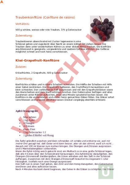 Traubenkonfitüre (Confiture de raisins) Verhältnis: 500 schöne, weisse oder rote Trauben, 375 Gelierzucker Zubereitung: Traubenbeeren abwechselnd mit Zucker lagenweise in eine Schüssel geben und zugedeckt über Nacht an einem kühlen Ort ziehen lassen. Die Trauben dann unter wiederholtem Rühren zu einer dicken Masse kochen. Die Konfitüre anschliessend in geeignete, vorgewärmte und saubere Gefässe abfüllen. Die Gefässe möglichst schnell und noch heiss verschliessen. Kiwi-Grapefruit-Konfitüre Zutaten: 6 Kiwifrüchte, 2 Grapefruits, 500 Gelierzucker Zubereitung: Kiwifrüchte schälen und in dünne Scheiben schneiden. Die Hälfte der Scheiben mit Hilfe einer Gabel zerdrücken. Die Grapefruits halbieren, das Fruchtfleisch herauslösen und klein schneiden. Den verbliebenen Saft auspressen und mit den Grapefruitstücken sowie den Kiwischeiben und dem Kiwifruchtmus mischen. Den Gelierzucker beifügen und alles zusammen unter Rühren aufkochen. Etwa eine Minute sprudelnd kochen lassen. Die Konfitüre in die vorbereiteten und vorher heiss gemachten Gläser füllen. Die Gläser sofort verschliessen und langsam abkühlen lassen (Deckel vorgängig ebenfalls erhitzen). Apfel-Orangengelee Man nehme: 1 kg Äpfel 4 Orangen 4 Zitronen etwas Zimt 1 kg Gelierzucker 1:1 1 großen Eßlöffel voll Honig Die Äpfel gründlich waschen und klein schneiden ich schäle und entkerne sie, weil mir meine Omi gesagt hat, daß Gelee wird dann besser, aber ob das stimmt, weiß ich nicht. danach mit 100 ml Wasser zum kochen bringen. Die Orangen und Zitronen auspressen und 5 Marmeladengläser vorbereiten. Wenn die Äpfel richtig weich gekocht sind, ein Mulltuch so in eine große Schüssel legen, daß alle 4 Ecken über den Schüsselrand herausragen. Die Apfelstücke daraufgeben, den Orangen-Zitronensaft darübergießen, die Ecken anheben und den Saft in der Schüssel auffangen. Zusammen mit dem Orangen-Zitronensaft brauchst Du insgesamt 1 Liter Flüssigkeit. (notfalls noch eine Orange auspressen) Den Saft nun in einen Topf geben, den Zimt und den Honig dazugeben, den Gelierzucker einrühren und alles aufkochen lassen. Nach 4 Minuten Kochzeit damit beginnen, das Gelee in die Gläser zu schöpfen. Die Gläser randvoll füllen, sofort verschließen und auf den Kopf stellen. (Damit die Gläser dabei nicht platzen, sie auf ein feuchtes Handtuch stellen vereinfacht auch die Putzerei hinterher.) Schaum, der sich im Topf auf dem Gelee bildet abschöpfen und nicht in die Gläser füllen sieht nicht so toll aus und verringert die Haltbarkeit. Sollte das Gelee nicht sofort gelieren, nicht wegwerfen! Manchmal läßt es sich eine Woche oder mehr Zeit! Kiwi-Orange Man nehme: 12 Kiwis (weich) pürieren und mit Orangensaft auf 750 ml auffüllen. 500 Gramm Gelierzucker 2:1 Unter Rühren zum Kochen bringen. Bei starker Hitze unter Rühren 1 Minute kochen lassen. In vorbereitete Gläser füllen.