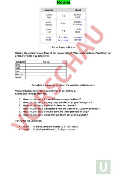 Nouns Plural forms – Nouns What is the correct plural form of the nouns below? Was ist die richtige Pluralform der unten stehenden Substantive? Singular hero radio roof domino belief Plural Complete the questions about the weather in Switzerland Vervollständige die Fragen zum Wetter in der Schweiz. Kreise das richtige Wort ein. 1. 2. 3. 4. 5. 6. How much many snow falls on average in Basel? How much many sunny days are there per year in Lugano? How much many rainfall is there in Lucerne? How much many thunderstorms are there in St. Gallen each year? How much many cloudy days are there per year in Brig? How much many blizzards are there per year in Zurich?