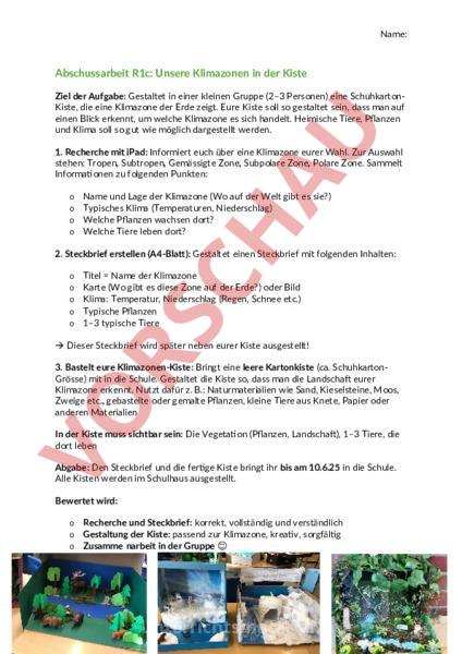 Name: Abschussarbeit R1c: Unsere Klimazonen in der Kiste Ziel der Aufgabe: Gestaltet in einer kleinen Gruppe (2–3 Personen) eine SchuhkartonKiste, die eine Klimazone der Erde zeigt. Eure Kiste soll so gestaltet sein, dass man auf einen Blick erkennt, um welche Klimazone es sich handelt. Heimische Tiere, Pflanzen und Klima soll so gut wie möglich dargestellt werden. 1. Recherche mit iPad: Informiert euch über eine Klimazone eurer Wahl. Zur Auswahl stehen: Tropen, Subtropen, Gemässigte Zone, Subpolare Zone, Polare Zone. Sammelt Informationen zu folgenden Punkten: o o Name und Lage der Klimazone (Wo auf der Welt gibt es sie?) Typisches Klima (Temperaturen, Niederschlag) Welche Pflanzen wachsen dort? Welche Tiere leben dort? 2. Steckbrief erstellen (A4-Blatt): Gestaltet einen Steckbrief mit folgenden Inhalten: o o Titel Name der Klimazone Karte (Wo gibt es diese Zone auf der Erde?) oder Bild Klima: Temperatur, Niederschlag (Regen, Schnee etc.) Typische Pflanzen 1–3 typische Tiere Dieser Steckbrief wird später neben eurer Kiste ausgestellt! 3. Bastelt eure Klimazonen-Kiste: Bringt eine leere Kartonkiste (ca. SchuhkartonGrösse) mit in die Schule. Gestaltet die Kiste so, dass man die Landschaft eurer Klimazone erkennt. Nutzt dafür z. B.: Naturmaterialien wie Sand, Kieselsteine, Moos, Zweige etc., gebastelte oder gemalte Pflanzen, kleine Tiere aus Knete, Papier oder anderen Materialien In der Kiste muss sichtbar sein: Die Vegetation (Pflanzen, Landschaft), 1–3 Tiere, die dort leben Abgabe: Den Steckbrief und die fertige Kiste bringt ihr bis am 10.6.25 in die Schule. Alle Kisten werden im Schulhaus ausgestellt. Bewertet wird: o Recherche und Steckbrief: korrekt, vollständig und verständlich Gestaltung der Kiste: passend zur Klimazone, kreativ, sorgfältig Zusamme narbeit in der Gruppe