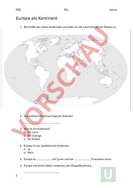 RZG R1c Name: Europa als Kontinent 1. Beschrifte die sieben Kontinente und male sie mit unterschiedlichen Farben an. 2. Auf welchem Kontinent liegt die Schweiz? 3. Was ist ein Kontinent? Ein Land Ein Gebirge Ein Erdteil 4. Europa ist der zweitkleinste Kontinent. Ja Nein 5. Europa ist km2 gross und hat . Einwohner:innen. 6. Europa und Asien bilden zusammen den Doppelkontinent 1 RZG R1c Name: 7. Der Name Europa stammt aus der Mythologie. 8. Wie heisst das Gebirge, das Europa von Asien trennt? Mount Everest Anden Ural 9. Welches ist die grösste Insel von Europa? 10. Welche Meere grenzen nicht an Europa? Streiche sie durch. Atlantik Pazifik Mittelmeer Nordsee Indischer Ozean Europäisches Nordmeer Barentsee Ostsee 11. Fülle die Lücken: Europa wird in Teile – je nach Lage unterteilt: Nordeuropa, Osteuropa, Südeuropa, Westeuropa und Mitteleuropa. Die Schweiz liegt in Europa umfasst . Länder. Das ist nicht ganz eindeutig wegen der Grenzziehung zu . Manche Länder gehören nur teilweise zu Europa. Das grösste Land bezogen auf die Fläche ist Das Land mit den meisten Einwohnern ist . 2