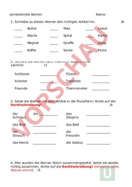Lernkontrolle Nomen Name: 1. Schreibe zu diesen Nomen den richtigen Artikel hin. /6 Butter Mais Lineal Wachs Spital Kamin Magnet Giraffe Essig Koffer Socke Ferse 2. Sortiere die Nomen nach männlich, weiblich und sächlich. /3 Schlösser Flüsse Scheitel Tabletten Freunde Thermometer 3. Setze die Nomen mit dem Artikel in die Pluralform! Achte auf die Rechtschreibung! /4 der Schnauz die das Zeugnis das Brot das Bett der Strauch die Freundin das Hemd der Kaktus 4. Hier wurden die Nomen falsch zusammengesetzt. Setze sie wieder richtig zusammen. Achte auf die Rechtschreibung! Verwende jedes Nomen einmal. /5 Glühpulver Kletterdose Sprühschran Lesefinger Schreibe die richtig zusammengesetzten Nomen mit dem Begleiter auf: 5. Ordne die Wörter den entsprechenden Oberbegriffen zu! /6 Achte auf die Rechtschreibung! Bohrmaschine Kalb Ekel Tierjungen Ferkel Teich Fohlen Werkzeug Angst Feile See Gefühl Hammer Ozean Trauer Gewässer 6. Wie heissen die Oberbegriffe (möglichst genau!)? Denk an die /4 Grossschreibung! Italien Ungarn Schweiz Deutschland Maus Ratte Eichhörnchen Biber Schwester Cousin Onkel Grossmutter Hut Mütze Zylinder Kappe 7. Mach aus diesen Wörtern ein Nomen!! Denk an die Endungen, welche du /10 gelernt hast! heilig klar verwandt hoffen sauber ergeben feige reich verstehen brauche 8. Suche im Text alle Nomen und unterstreiche sie braun. 5 HERBST IM PARK AM FRÜHEN MORGEN LIEGT NEBEL ÜBER DEM PARK. DIE BÄUME TRAGEN BUNTE BLÄTTER. EIN EICHHÖRNCHEN SAMMELT NÜSSE FÜR DEN WINTER. ZWEI KINDER SUCHEN KASTANIEN AM BODEN. PLÖTZLICH RASCHELT ES UNTER DEM BLÄTTERHAUFEN. OB SICH DA WOHL EIN IGEL VERSTECKT HAT? DIE SONNE KÄMPFT SICH DURCH UND TAUCHT DIE LANDSCHAFT IN GOLDENES LICHT. DER HERBSTTAG ZEIGT SICH VON SEINER SCHÖNSTEN SEITE. Rückmeldung: Heute fühle ich mich fit, wohl und leistungsbereit. Es stand mir genügend Zeit zur Verfügung. Ich habe nachkontrolliert. Ich habe mich gut auf die Prüfung vorbereitet. Viele Aufgaben waren für mich gut lösbar. Anzahl Punkte: Note: Unterschrift Eltern