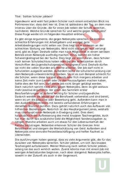 Titel: Sollten Schüler jobben? Irgendwann wird wohl fast jedem Schüler nach einem entsetzten Blick ins Portmonee klar, dass dort leer ist. Dies ist spätestens der Tag, an dem man intensiv über die Gründe, die für einen Job neben der Schule sprechen, nachdenkt. Welche Gründe sprechen für und welche gegen Nebenjobs? Diese Frage werde ich im folgenden Hauptteil erörtern. Es gibt einige Argumente, die gegen Nebenjobs sprechen. So kommen schlechte Erfahrungen mit Arbeitgebern und weniger gute Arbeitsbedingungen nicht selten vor. Dies liegt unter anderem an der schlechten Stellung von Nebenjobs. Wird nicht das getan, was verlangt wird, gibt es Ärger. Deshalb sollte man nach Möglichkeit in einem seriösen Betrieb einen Nebenjob ausfindig machen. Hinzu kommt ein hoher Schwierigkeitsgrad bei der Suche. Dies liegt vor allem daran, dass Schüler noch keinen Schulabschluss haben oder bei den Arbeitszeiten durch Vorschriften des Jugendschutzgesetzes eingegrenzt sind. Deshalb dürfen sie nicht die vollen Stunden pro Woche arbeiten. Der Job darf nicht in Schulzeiten ausgeübt werden. Außerdem sollte die schulische Leistung von dem Nebenjob unbeeinträchtigt bleiben. So ist es zum Beispiel schlecht für die Schüler, wenn diese bis spät abends oder früh morgens arbeiten und keine Zeit mehr zum Lernen oder zu den Hausaufgaben machen haben. Sollte dies der Fall sein, darf dieser Job nicht länger getätigt werden. Doch natürlich spricht nicht alles gegen Nebenjobs, denn es gibt weitaus mehr positive Argumente. Vor allem das Sammeln erster Berufserfahrungen ist äußerst wichtig für Schüler und Jugendliche. Dadurch werden sie besser auf die Berufswelt vorbereitet und sind bereit, wenn es um die Jobsuche oder Bewerbung geht. Außerdem kann man in den Ausbildungsbetrieben mit bereits vorhandenen Erfahrungen in derselben Branche punkten. Dazu gehört natürlich auch das Aufbauen von hilfreichen Beziehungen. Natürlich ist das Hauptargument jenes, weshalb man überhaupt einen Nebenjob in Erwägung zieht. Dies dient hauptsächlich der Aufbesserung des meist knappen Taschengeldes. Auch hat man durch das zusätzliche Geld die Möglichkeit Sonderausgaben zu tätigen. Manche arbeiten auch um etwas für den Lebensunterhalt der Familie beizutragen. Nebenbei erkennen Schüler die Grenzen ihrer Belastbarkeit und steigern die Wertschätzung von Geld. Außerdem sind Nebenjobs eine sinnvolle Freizeitbeschäftigung und helfen Faulheit zu überwinden. Die Ausführungen haben gezeigt, dass es viele Argumente gibt, die für das Ausüben von Nebenjobs sprechen. Schüler jobben, um sich das knappe Taschengeld aufzubessern. Meiner Meinung nach sollten Schüler jobben, solang sie das auch wirklich wollen. Zuerst könnte man mit einem Job mit wenigen Arbeitsstunden beginnen, nach oben steigernd. Nebenjobs helfen, sowohl in der Zukunft als auch in der Gegenwart.