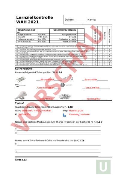 Lernzielkontrolle WAH 2021 Ausgezeichnet Ab 95% 70%-95% bis 70% bis 50% Erreicht Gesamteinschätzung 1 2 3 1 2 1 4 2 6 3 1 1 2 2 3 3 4 1 1 1 1 2 2 2 2 3 3 3 3 Teilweise erreicht Nicht erreicht Bewertungsrast er Ausgezeichnet Erreicht Teilweise erreicht Nicht erreicht Datum: Name: Ausgezeichnet Erreicht Teilweise erreicht Nicht erreicht LZ 1 Ich kann 4 wichtige Rohkostregeln aufzählen und weiss in welche zwei Nahrungsmittelgruppen sie unterteilt werden (4.4c) LZ 2 Ich weiss, wie man fachlich korrekt abwäscht. (5.1b) LZ 3 Ich weiss bei meinem Ämtli, was ich erledigen muss und weiss theoretisch über die anderen 2 Ämtli Bescheid. (5.1b) LZ 4 Ich kann eine Salatsauce herstellen und einen Blattsalat fachlich korrekt zubereiten. (4.4c) LZ 5 Ich kann die Körperfunktionen aufzählen, für die wir die Vitamine brauchen und weiss welche Umwelteinflüsse sie zerstören. (4.4c) LZ 6 Ich kenne die wichtigsten Küchengeräte korrekt benennen. (5.1b) LZ 7 Ich kenne den Kochvorgang Sieden und kann Teigwaren korrekt zubereiten. (4.4c) LZ 8 Ich kenne den Aufbau vom Tiptopf und die wichtigsten Abkürzungen und Regeln LZ 9 Ich kenne die verschiedenen Betriebsarten des Backofens und kann diese optimal nutzen. (5.1b) Küchengeräte Benenne folgende Küchengeräte! (3P.) LZ6 Bircherraffel SparschälerGummischaberSchaumkelleSpritzbeutel_ Kuchengitter Tiptopf Was bedeuten die folgenden Abkürzungen? (2P.) LZ8 WAH: Wirtschaft, Arbeit, Haushalt KL:Kaffeelöffel Msp: Messerspitze Ableitung, Variante Nenne drei wichtige Merkpunkte zum Thema Hygiene in der Küche! (1 P.) LZ 7 1) 2) 3) Nenne zwei Küchenfachausdrücke und beschreibe sie! (1P.) LZ8 1) 2) Ämtli LZ3 Im WAH-Unterricht hast du jeweils ein Ämtchen beim Aufräumen. Beschreibe dieses und die dazu gehörenden fünf Ämtchenaufgaben möglichst genau! ÄMTCHENNUMMER:_(3P.) Abwaschen LZ2 a) Zeichne unten ins Feld eine Abwaschkombination mit Legende. Es müssen folgende Dinge vorhanden sein: (je P.) 1) 1 Kleines Abwaschbecken 2) 1 Abwaschbecken 3) schmutziges Geschirr 4) Abtropffläche für sauberes Geschirr b) Liste die richtige Abwaschreihenfolge des Geschirrs auf. (je P.) Abwaschreihenfolge: 1.Gläser 2._Besteck_ 3. 4. 5. c) Worauf achtest du beim Abwaschen bei den folgenden Begriffen: (je P.) Weshalb sollte man beschichtete Pfannen nie mit Stahlwatte reinigen? Wieso soll das Wasser möglichst heiss sein beim Abwaschen? Warum gibst du das Spülmittel erst ins Spülbecken wenn es voll ist? Begründe! Backofen LZ9 Zeichne das Signet für die Betriebsart Ober-/Unterhitze und das Signet für die Grill Heissluft Funktion (1P.) Was ist der Unterschied zwischen Heissluft und Ober-/Unterhitze? (1P.) Welche zwei „Schalter/Knöpfe musst du einschalten, damit der Backofen läuft? (1P.) Rohkost Welche zwei Grundnahrungsmittel fallen unter den Begriff Rohkost? (1P.) LZ1 Nenne 4 Rohkostregeln! (2P.) LZ1 Welche 4 Umwelteinflüsse können die Vitamine und Mineralstoffe zerstören? (2P.) LZ5 Wieso müssen wir die Vitamine mit der Nahrung aufnehmen? (1P.) LZ5 Für welche Körperfunktionen brauchen wir die Vitamine? Nenne 2! (1P.) LZ5 Darf man alle Salate direkt mit der Sauce mischen? Welche Salate darf man mischen welche nicht? BEGRÜNDE! (3P.) LZ4 Sieden LZ7 a) Du kochst für deine Eltern Nudeln. Beschreibe jeden einzelnen Arbeitsschritt. (3P.) 1. 2. 3. b) Weshalb gibst du das Salz erst ins siedende Wasser? (P.)