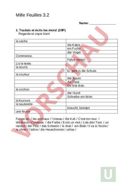 Mille Feuilles 3.2 Name: 1. Traduis et écris les mots! (20P) Regarde et copie bien! la vache die Katze ein Fuchs der Vogel Commence. Fahre weiter! Lis le texte. la souris Er geht in die Schule. la couleur der Baum die Tiere Du bist dran. le cochon der Hund Schreibe ein Wort. la fourrure la sauterelle braucht, benützt une feuille Fange an. les animaux loiseau die Kuh Cest ton tour. die Maus Continue. die Farbe Ecris un mot./ Lies den Text. un renard der Pelz das Schwein le chat ein Blatt Il va à lécole./ le chien larbre die Heuschrecke utilise