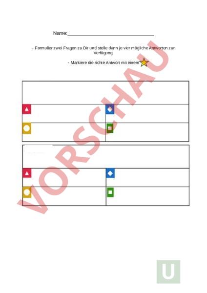 Name: Formulier zwei Fragen zu Dir und stelle dann je vier mögliche Antworten zur Verfügung. Markiere die richte Antwort mit einem