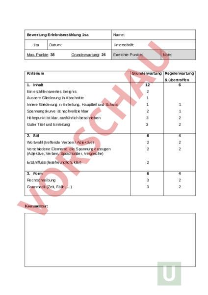 Bewertung Erlebniserzählung 1sa 1sa Datum: Max. Punkte: 38 Name: Unterschrift: Grunderwartung: 24 Erreichte Punkte: Kriterium Note: Grunderwartung Regelerwartung übertroffen 6 1. Inhalt 12 Ein erzählenswertes Ereignis 2 Äussere Gliederung in Abschnitte 1 Innere Gliederung in Einleitung, Hauptteil und Schuss 1 1 Spannungskurve ist nachvollziehbar 2 1 Höhepunkt ist klar, ausführlich beschrieben 3 2 Guter Titel und Einleitung 3 2 2. Stil 6 4 Wortwahl (treffende Verben Adjektive) 2 2 Verschiedene Elemente, die Spannung erzeugen (Adjektive, Verben, Sprachbilder, Vergleiche) 2 2 Erzählfluss (lesefreundlich, klar) 2 3. Form 6 4 Rechtschreibung 3 2 Grammatik (Zeit, Fälle, ) 3 2 Kommentar: