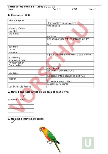 Vocitest: dis donc 8 – unité 3 LZ 1-3 Nom: Points: 36 Note: 1. Übersetze! (14) das Säugetier transmettre des maladies une espèce wissen, können der Hai die Beute capturer Les lions attaquent les antilopes et les tue. das Heu retten kennen Il peut atteindre une vitesse de 55 km/h. schmutzig sich verstecken Hunger haben Durst haben combien de un animal de compagnie ein Stück Le hamster fait beaucoup de bruit. fliegen Je bois un verre deau. ressembler à qn/qc das Maul, die Fresse 2. Note 4 endroits (Orte) où un animal peut vivre. /4 example: la mer 3. Nomme 5 parties du corps. /5 4. Ergänze mit: die Tiere, ein Raubtier, der Urwald, ein Vogel, mithilfe von, alleine, gefährlich, ein Fisch, wiegt, die Körner, das Männchen, fleischfressend, eine Nahrung/Ernährung (13) Il navigue de ses nageoires. La baleine (der Wal) préfère végétarienne. Le chat vit Les souris aiment Le lion est Le dauphin nest pas Le perroquet (der Papagei) vit dans Mon chat environ trois kilos. Le tigre est un animal très Il faut faire attention! peut voler. Les chats aiment le manger. Le lion aime la viande. Il est La femelle fait deux mètres de long, le fait trois mètres Jai un chien, un chat et un lapin. Jaime Bonne chance!