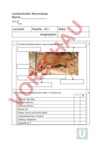 Lernkontrolle: Rennmäuse Name:_ 23.9.25 6.KL Lernziel: Punkte: 42 Note: eingesehen: 1. Schreibe die Körperteile in den passenden Kasten. 7 2. Steckbrief: Richtig oder falsch ? Kreuze an! 4 Gewicht: 80-100g Puls: bis 60/min Atmung: 90/min Zähne: 20 Zehen: vorne und hinten gleich Lebenserwartung: 10 Jahre Gattung: Nagetiere Nagezähne: 2 3. Schreibe alle Sinnesorgane auf, die wir besprochen haben. 5 4. Entscheide dich für ein Sinnesorgan und schreibe alles auf, was du darüber weisst. 3 5. Schreibe die richtige Fellfarbe unter das Bild. 4 6. Nenne drei weitere Fellfarben. 3 7. Richtig oder falsch ? Kreuze an! 4 Tiere sind Sachen wie Tische oder Fahrräder. Tiere brauchen Pflege, Futter und Zuwendung. Eine Rennmaus darf man alleine halten. Es gibt keine Mindestgrösse für Rennmauskäfige. Das Tierschutzgesetz regelt wie teuer ein Tier höchstens sein darf. Im Tierschutzgesetz steht, dass es verboten ist, Tiere zu quälen. Seit 2003 sind Tiere keine Sachen mehr. Zoos müssen sich nicht an das Tierschutzgesetz halten. 8. Nenne einen Punkt, der im Tierschutzgesetz geregelt ist und schreibe dazu ein konkretes Beispiel auf. Tierschutzgesetz Konkretes Beispiel 2 9. Woher stammen unsere Rennmäuse ursprünglich? Zeichne es in der Karte ein. 1 1 0. 1 1. Ordne jedem Kasten auf der linken Seite eine passende Aussage auf der rechten Seite zu. Verbinde dazu die Kästen mit Pfeilen. Rennmäuse brauchen viel Platz. Rennmäuse darf man auf keinen Fall alleine halten. Wilde Rennmäuse wohnen in unterirdischen Höhlen. Wenn man nicht züchten möchte, sollte man kein Pärchen halten, sondern zwei Weibchen oder zwei Männchen. Rennmäuse leben in Familienver-bänden. Rennmäuse brauchen ab und zu etwas frisches Haushaltspapier. Sie brauchen es als Nistmaterial für ihre Schlafkammer. Rennmäuse werden früh geschlechtsreif und bekommen viele Junge. Rennmäuse brauchen ein Holzhäuschen als Versteckmöglichkeit und viel Einstreu zum Wühlen. Rennmäuse fressen gerne Pflanzensamen. Ein grosses Aquarium oder ein Plexiglasstall eignen sich gut als Käfig. Rennmäuse brauchen Nistmaterial für ihre Schlafkammer. Im Zoohandel bekommt man eine spezielle Samenmischung. Sie fressen auch gerne Grünfutter. Zeichne mit Bleisstift eine Rennmaus, die auf ihren Hinterbeinen steht. Achte auf die richtigen Proportionen. 6 3