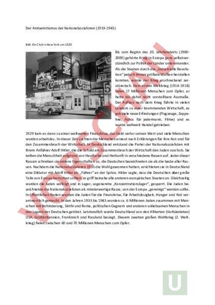 Der Antisemitismus der Nationalsozialisten (1933-1945) Bild: Ein Club in New York um 1920 Bis zum Beginn des 20. Jahrhunderts (19002000) gehörte Krieg in Europa ganz selbstverständlich zur Politik der Länder untereinander. Als die Staaten durch die „Industrielle Revolution jedoch immer größere Waffen herstellen konnten, wurde der Krieg erschreckend zerstörerisch. Dem ersten Weltkrieg (1914-1918) fielen 17 Millionen Menschen zum Opfer, er hatte bis dahin nicht vorstellbare Ausmaße. Der Aufbau nach dem Krieg führte in vielen Ländern zu einer brummenden Wirtschaft, es gab viele neue Erfindungen (Flugzeuge, Zeppeline, Autos für jedermann, Filme) und es wurde weltweit Handel getrieben. 1929 kam es dann zu einer weltweiten Finanzkrise, das Geld verlor seinen Wert und viele Menschen wurden arbeitslos. In dieser Zeit suchten die Menschen erneut nach Erklärungen für ihre Not und für den Zusammenbruch der Wirtschaft. In Deutschland entstand die Partei der Nationalsozialisten mit ihrem Anführer Adolf Hitler, die die Schuld am Zusammenbruch der Wirtschaft den Juden zuschob. Sie teilten die Menschheit aufgrund von Hautfarbe und Herkunft in verschiedene Rassen auf. Jeder dieser Rassen schrieben sie andere Eigenschaften zu, die Deutschen bezeichneten sie als die beste aller Rassen. Nachdem die Nationalsozialisten 1933 die Wahl gewonnen hatten, errichteten sie in Deutschland eine Diktatur mit Adolf Hitler als „Führer an der Spitze. Hitler sagte, dass die Deutschen über große Teile von Europa herrschen sollten, er griff beinahe alle anderen europäischen Staaten an. Gleichzeitig wurden die Juden verfolgt und in Lager, sogenannte „Konzentrationslager, gesperrt. Die Juden bezeichneten die Nationalsozialisten als minderwertige Rasse, von der Europa „gereinigt werden sollte. In öffentlichen Reden wurden die Juden für die Finanzkrise, für Arbeitslosigkeit, Hunger und Not verantwortlich gemacht. In den Jahren 1933 bis 1945 wurden ca. 6 Millionen Juden zusammen mit Menschen mit Behinderung, Sinthi und Roma, politischen Gegnern und anderen unliebsamen Menschen in den Lagern der Deutschen getötet. Letztendlich wurde Deutschland von den Alliierten (Verbündeten) USA, Großbritannien, Frankreich und Russland besiegt. Diesem zweiten großen Weltkrieg (2. Weltkrieg) fielen zwischen 60 und 70 Millionen Menschen zum Opfer. Ganze Landstriche und Städte wurden in Schutt und Asche gelegt. Hitler und weitere hohe Politiker brachten sich schließlich um und Deutschland kapitulierte (gab auf). Bild: Das zerstörte Frankfurt im Jahr 1945 Adolf Hitler war schon vor seiner Zeit als Diktator Antisemit. Hier seht ihr einen Auszug aus einem Schreiben, dass er 1919 verfasst hat. Darin beschreibt er, wie er die Juden sieht (einige Begriffe sind in Klammern genauer erklärt): „[] Zunächst ist das Judentum unbedingt eine Rasse und nicht Religionsgenossenschaft (Religionsgemeinschaft). [] Er (der jüdische Mensch) zerstört den Charakter des Fürsten durch byzantinische Schmeichelei (das heißt so viel wie „Schleimerei), den nationalen Stolz, die Kraft eines Volkes, durch Spott und schamloses Erziehen zum Laster (also zu schlechtem Verhalten). Sein Mittel zum Kampf ist jene öffentliche Meinung, die nie ausgedrückt wird durch die Presse, wohl aber immer durch sie geführt und gefälscht wird (also so etwas wie der geheime „Text zwischen den Zeilen in den Zeitungen). Seine Macht ist die Macht des Geldes, das sich in Form des Zinses in seinen Händen mühe- und endlos vermehrt []. Alles was Menschen zu Höherem streben lässt, sei es Religion, Sozialismus, Demokratie, es ist ihm alles nur Mittel zum Zweck, Geld und Herrschgier zu befriedigen. [Unser] letztes Ziel aber muss unverrückbar die Entfernung der Juden überhaupt sein. Aufgaben: 1. 2. 3. 4. 5. Welche Eigenschaften werden den Juden in dem Text nachgesagt? Woher beziehen die Juden angeblich ihre Macht? Was ist der Unterschied zwischen dem Begriff der „Rasse und einer Religionsgemeinschaft? Wozu hat die Unterteilung der Welt in Rassen geführt? Wäre ein jüdischer Mensch, der kein Geld hat, vor der Verfolgung durch die Nationalsozialisten sicher gewesen? Begründe!