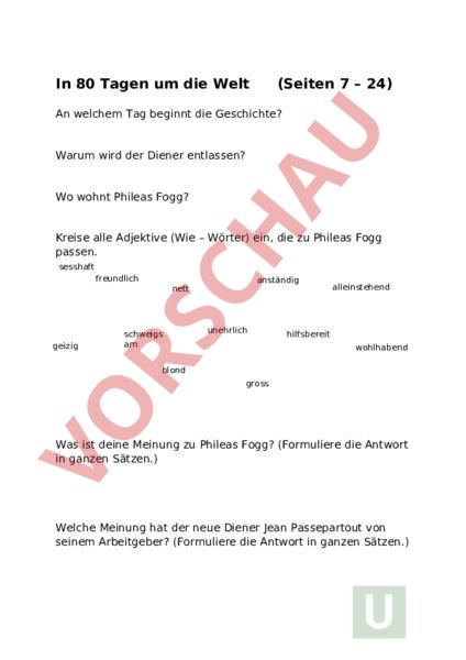 In 80 Tagen um die Welt (Seiten 7 – 24) An welchem Tag beginnt die Geschichte? Warum wird der Diener entlassen? Wo wohnt Phileas Fogg? Kreise alle Adjektive (Wie – Wörter) ein, die zu Phileas Fogg passen. sesshaft freundlich anständig nett geizig schweigs am unehrlich alleinstehend hilfsbereit wohlhabend blond gross Was ist deine Meinung zu Phileas Fogg? (Formuliere die Antwort in ganzen Sätzen.) Welche Meinung hat der neue Diener Jean Passepartout von seinem Arbeitgeber? (Formuliere die Antwort in ganzen Sätzen.) Was erwartet Phileas Fogg von seinem neuen Diener vor allem? Ergänze die folgende Tabelle mit der von Phileas Fogg geplanten Reise. Etappe Transportmittel London – Suez Zug und Schiff geplante Reisedauer 7 Tage Welche Aussagen gehören zur Wette? Streiche die falschen Sätze durch. Phileas Fogg will in 80 Tagen um die Welt reisen, Die Herren wetten um 50 00 Pfund. Die Herren wetten um 20 00 Pfund. Fogg macht Fotos als Beweis für seine Reise. Die Stempel im Reisepass sollen beweisen, dass Fogg um die ganze Welt gereist ist. Wann muss Phileas Fogg von seiner Reise zurück sein, wenn er die Wette gewinnen will? Was soll Passepartout alles für die Reise einpacken? Was kommt sonst noch ins Gepäck? Wer ist Mr. Fix? Welchen Plan hat er? Warum erreicht das Schiff die Stadt Mumbai früher als geplant? Welches Missgeschick passiert Passepartout in Mumbay? Stell dir vor, du berichtest den Mitgliedern des Reformclubs „live von einer Begebenheit der bisherigen Reise. Wähle ein passendes Datum und verfasse ein Telegramm (kurze Mitteilung, einfache Sätze, max. 300 Zeichen). Verfasse ein WORD – Dokument, das Programm zählt dir dann die Zeichen automatisch.