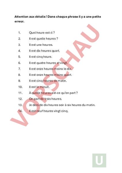 Attention aux détails Dans chaque phrase il a une petite erreur. 1. Quel heure est-il 2. Il est quelle heures 3. Il est une heures. 4. Il est dix heures quart. 5. Il est cinq heure. 6. Il est quatre heures et vingt. 7. Il est onze heures moins le dix. 8. Il est onze heures moins quart. 9. Il est cinq heures de matin. 10. Il est le minuit. 11. À quelle heures est-ce quon part 12. On part de trois heures. 13. Je dors de dix heures soir à six heures du matin. 14. Il est neuf heures vingt cinq.