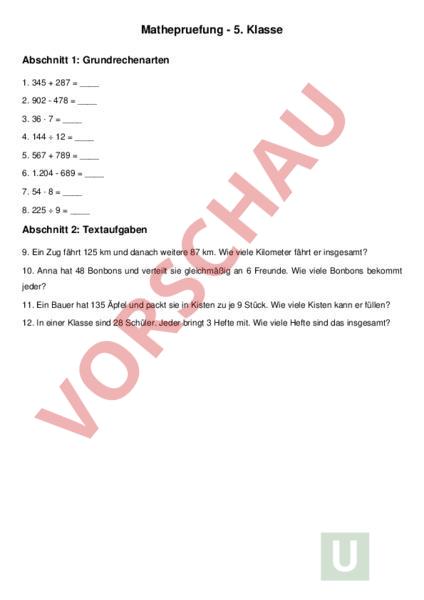Mathepruefung 5. Klasse Abschnitt 1: Grundrechenarten 1. 345 287 2. 902 478 3. 36 · 7 4. 144 12 5. 567 789 6. 1.204 689 7. 54 · 8 8. 225 9 Abschnitt 2: Textaufgaben 9. Ein Zug fährt 125 km und danach weitere 87 km. Wie viele Kilometer fährt er insgesamt? 10. Anna hat 48 Bonbons und verteilt sie gleichmäßig an 6 Freunde. Wie viele Bonbons bekommt jeder? 11. Ein Bauer hat 135 Äpfel und packt sie in Kisten zu je 9 Stück. Wie viele Kisten kann er füllen? 12. In einer Klasse sind 28 Schüler. Jeder bringt 3 Hefte mit. Wie viele Hefte sind das insgesamt? Mathepruefung 5. Klasse Abschnitt 3: Geometrie 13. Zeichne ein Rechteck mit den Seitenlängen 5 cm und 3 cm. Berechne anschließend den Umfang. 14. Ein Dreieck hat die Seiten 6 cm, 7 cm und 5 cm. Berechne den Umfang. 15. Ein Quadrat hat eine Seitenlänge von 4 cm. Berechne den Umfang und die Fläche. 16. Ein Rechteck hat die Seiten 12 cm und 9 cm. Berechne die Fläche. Abschnitt 4: Sachaufgaben Logik 17. Tom hat doppelt so viele Murmeln wie Lea. Lea hat 14 Murmeln. Wie viele hat Tom? 18. Eine Packung enthält 24 Kekse. 5 Kinder teilen sie gerecht. Wie viele Kekse bekommt jedes Kind? 19. Ein Hund läuft 3 km am Morgen und 2 km am Abend. Wie viele Meter läuft er insgesamt? 20. Eine Flasche fasst 1 Liter. Wie viele Milliliter sind das?