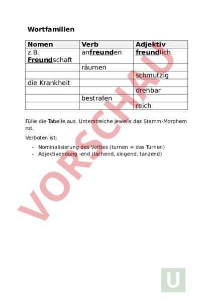Wortfamilien Nomen z.B. Freundschaft Verb anfreunden Adjektiv freundlich räumen schmutzig die Krankheit drehbar bestrafen reich Fülle die Tabelle aus. Unterstreiche jeweils das Stamm-Morphem rot. Verboten ist: Nominalisierung des Verbes (turnen das Turnen) Adjektivendung -end (lachend, singend, tanzend)