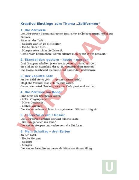 Kreative Einstiege zum Thema „Zeitformen 1. Die Zeitreise Die Lehrperson kommt mit einem Hut, einer Brille oder einem Koffer ins Zimmer. Sätze an der Tafel: Gestern war ich im Mittelalter. Heute bin ich hier. Morgen reise ich in die Zukunft. Gemeinsam besprechen: Woran erkennt man, wann etwas passiert? 2. Standbilder: gestern – heute – morgen Drei Gruppen erhalten je ein Wort: gestern, heute, morgen. Sie stellen ein Standbild dar (z. B. Hausaufgaben machen). Die Klasse beschreibt die Szene mit passenden Zeitformen. 3. Der kaputte Satz An der Tafel steht: „Ich gestern einen Apfel. Mögliche Verben: esse aß werde essen. Gemeinsam wird überlegt, welches Verb passt und warum. 4. Die Zeitlinie am Boden Eine Linie am Boden markieren: links: Vergangenheit Mitte: Gegenwart rechts: Zukunft Die Kinder ordnen sich nach vorgelesenen Sätzen richtig ein. 5. Lehrer*in erzählt Unsinn Die Lehrperson erzählt bewusst falsche Sätze: „Gestern gehe ich ins Kino. Die Kinder stoppen und verbessern die Zeitform. 6. Mein Schultag – drei Zeiten An der Tafel: Heute Morgen Gestern Morgen Die Kinder formulieren passende Sätze aus ihrem Alltag.