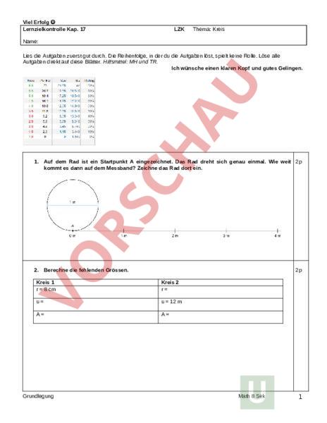 Viel Erfolg Lernzielkontrolle Kap. 17 LZK Thema: Kreis Name: Lies die Aufgaben zuerst gut durch. Die Reihenfolge, in der du die Aufgaben löst, spielt keine Rolle. Löse alle Aufgaben direkt auf diese Blätter. Hilfsmittel: MH und TR. Ich wünsche einen klaren Kopf und gutes Gelingen. 1. Auf dem Rad ist ein Startpunkt eingezeichnet. Das Rad dreht sich genau einmal. Wie weit 2p kommt es dann auf dem Messband? Zeichne das Rad dort ein. 2. Berechne die fehlenden Grössen. 2p Kreis 1 8 cm Kreis 2 r u 12 A A Grundlegung Math 8 Sek 1 Viel Erfolg 3. Die Seitenlänge des Quadrates misst 10 cm. 3p Um wie viel länger ist der Umfang des Quadrates als der Umfang des Kreises? Um wie viel grösser ist der Flächeninhalt des Quadrates als der Flächeninhalt des Kreises? 4. Gegeben ist ein Kreiszylinder mit 10 cm und 12 cm. 3p Berechne seine Oberfläche. Berechne sein Volumen. Grundlegung Math 8 Sek 2 Viel Erfolg 5. Berechne die Länge der blauen Linie. 3p 6. Berechne den Flächeninhalt und die Länge des blauen Bogens bei diesem Kreissektor. Miss die für die Berechnung notwendigen Grössen. 4p Total 17p Grundlegung Math 8 Sek 3 Viel Erfolg LZZ 1. Der Flächeninhalt des Quadrates ABCD misst a2. 1.5p Wie lang ist der Umfang des Quadrates? Wie gross ist der Flächeninhalt des Kreises? Wie lang ist die blaue Kreislinie? 2. Von vier verschiedenen Kreisen kennt man jeweils eine Grösse. Berechne die anderen drei. Grundlegung Math 8 Sek 2p 4 Viel Erfolg 3. Das Dreieck ABC ist gleichseitig. Seine Seitenlänge misst 12 cm. Berechne die gesamte Länge 1p der blau gefärbten Linie. 4. Berechne den Flächeninhalt der blauen Figur. 1.5p Berechne den Flächeninhalt der grauen Figur. Vergleiche. 6p Grundlegung Math 8 Sek 5