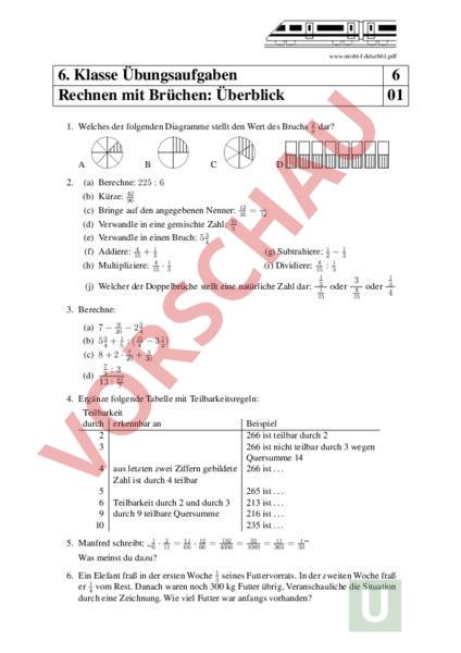 Arbeitsblatt: Matheübungen und Matheaufgaben 6. Klasse mit Lösungen